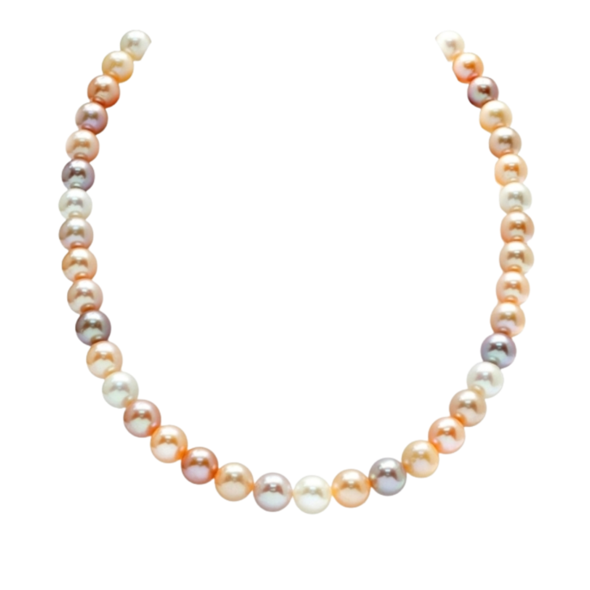 17.5 Inch Multicolor South Sea & Freshwater Pearl Necklace featuring 31 Peach, Pink, Golden, Black, and White Pearls measuring 13.1-15.1mm Strung onto a 14kt Yellow Gold Ball Clasp with 13 H/SI Quality Round Brilliant Cut Diamonds weighing a total of 0.13cts