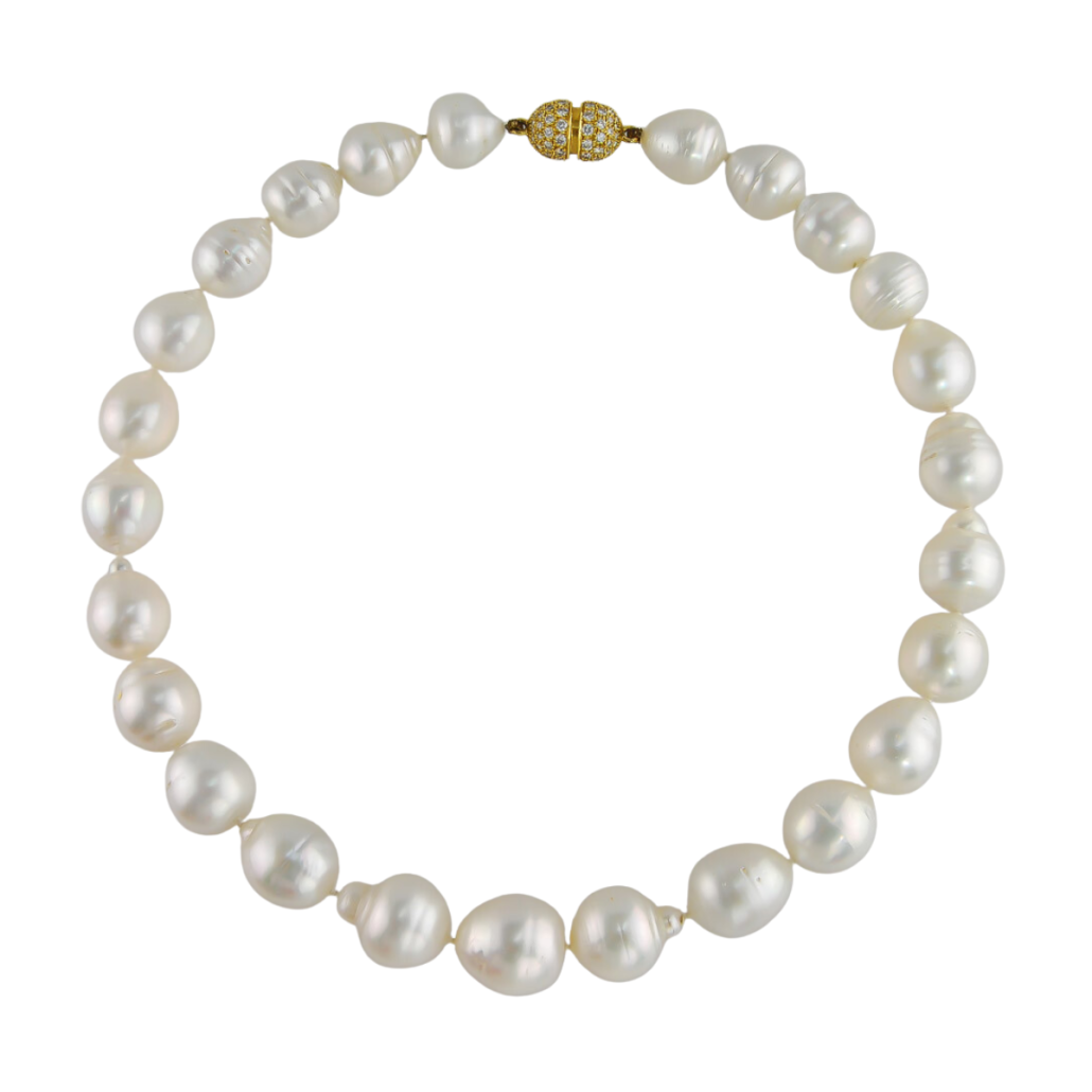 18 Inch Baroque South Sea Pearl Strand Necklace featuring 25 Baroque South Sea Pearls measuring from 13 to 17mm with an 18kt Yellow Gold Diamond Bayonette Clasp featuring 98 Round Brilliant Cut G/VS Quality Diamonds weighing a total of 2.03cts