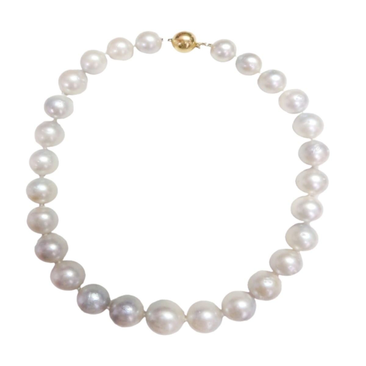 19 Inch Round South Sea Pearl Strand Necklace featuring 29 Round South Sea Pearls measuring from 14 to 18mm with an 18kt Yellow Gold Tongue in Oval Swirl Clasp