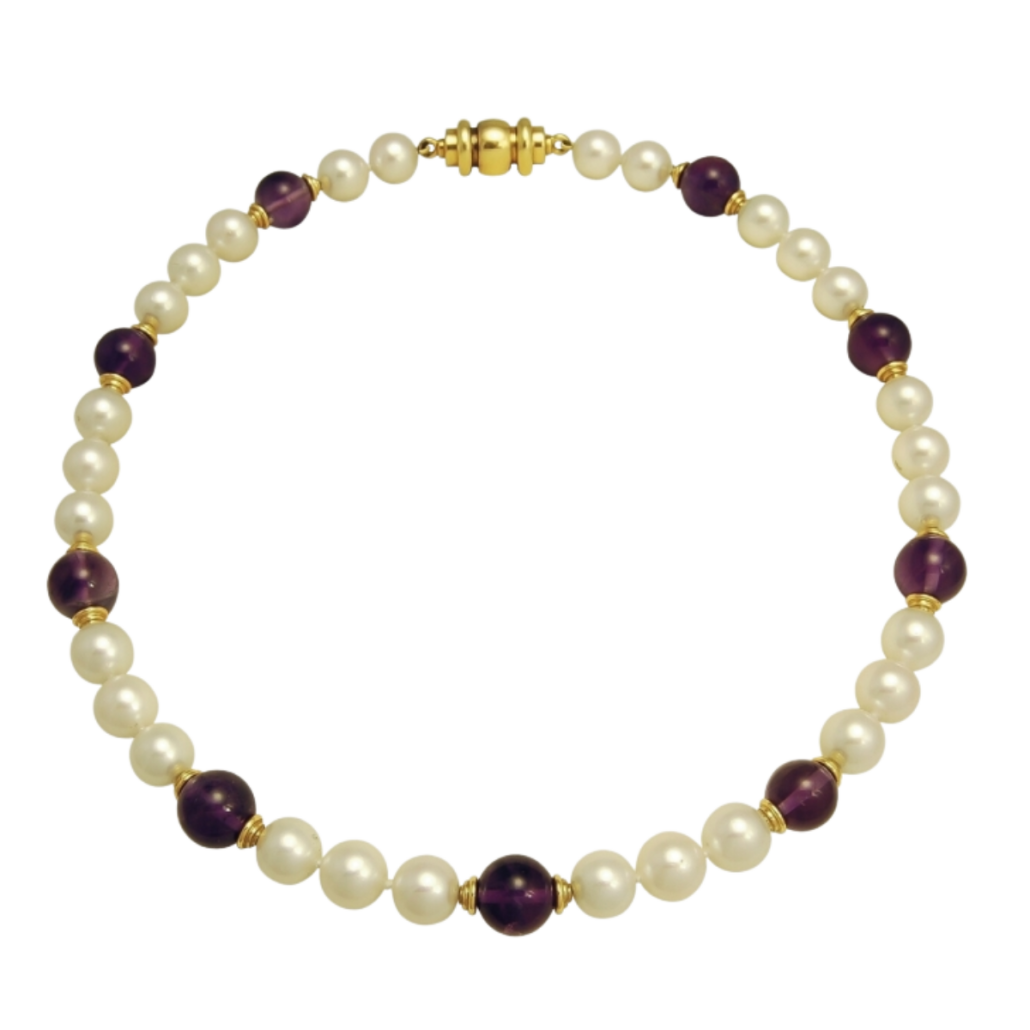 Akoya Pearl & Amethyst Bead Necklace with Yellow Gold Bayonette Clasp