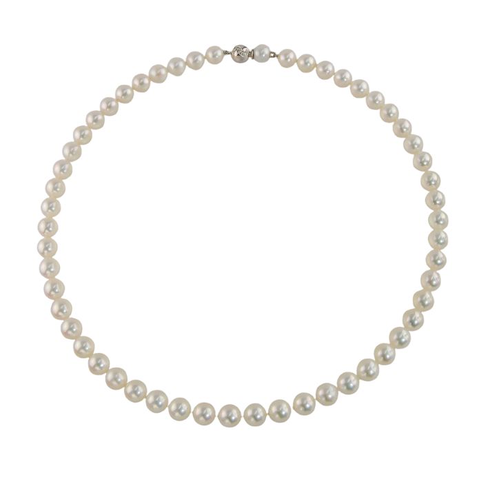 18 Inch Akoya Pearl Strand Necklace Designed and Handmade by Kaufmann de Suisse featuring 54 Akoya Pearls measuring 7.5-8mm strung with an 18kt White Gold Bayonette Clasp featuring 14 Round Brilliant Cut F/VVS Quality Diamonds weighing a total of 0.14cts