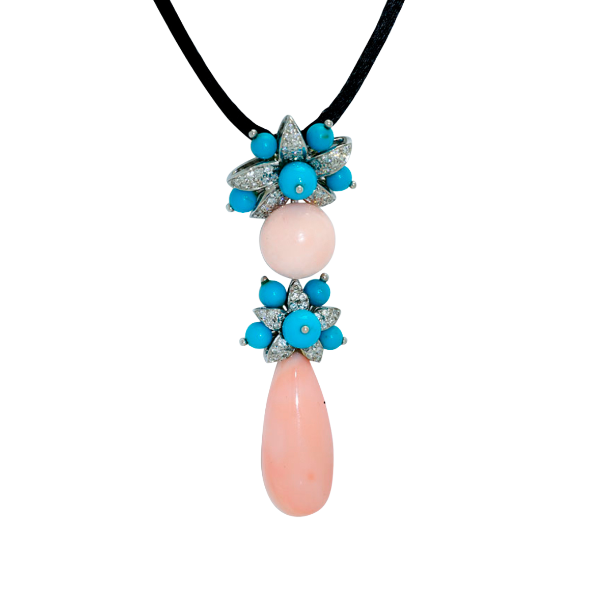 Angel Skin Coral, Turquoise & Diamond Jasmin Drop White Gold Pendant on Black Silk Cord