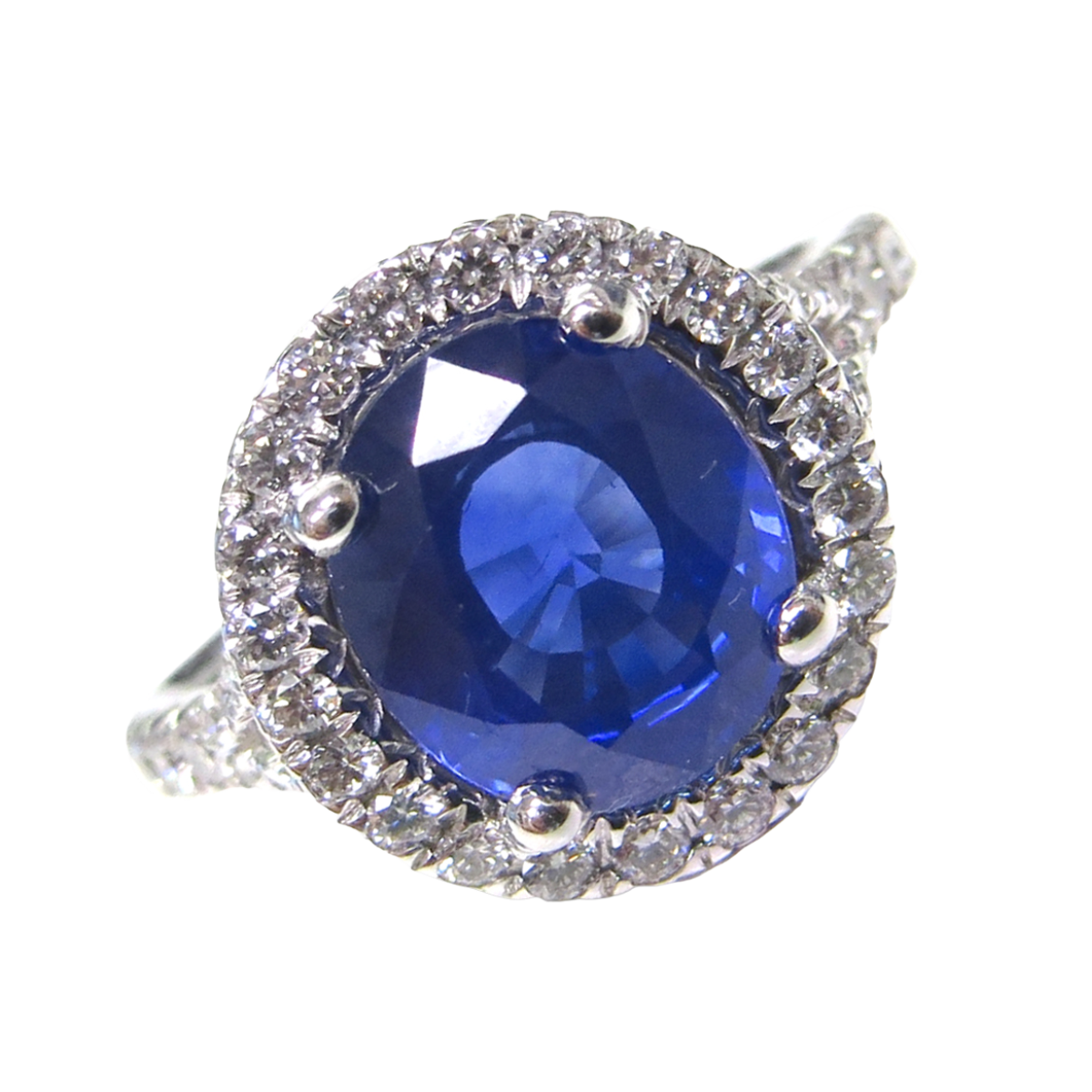 Sapphire and Diamond Halo Ring Designed and Handmade in 18kt White Gold featuring one Oval 3.15cts Blue Sapphire surrounded by 46 Round Brilliant cut G/VS Quality Diamonds weighing a total of 1.05cts