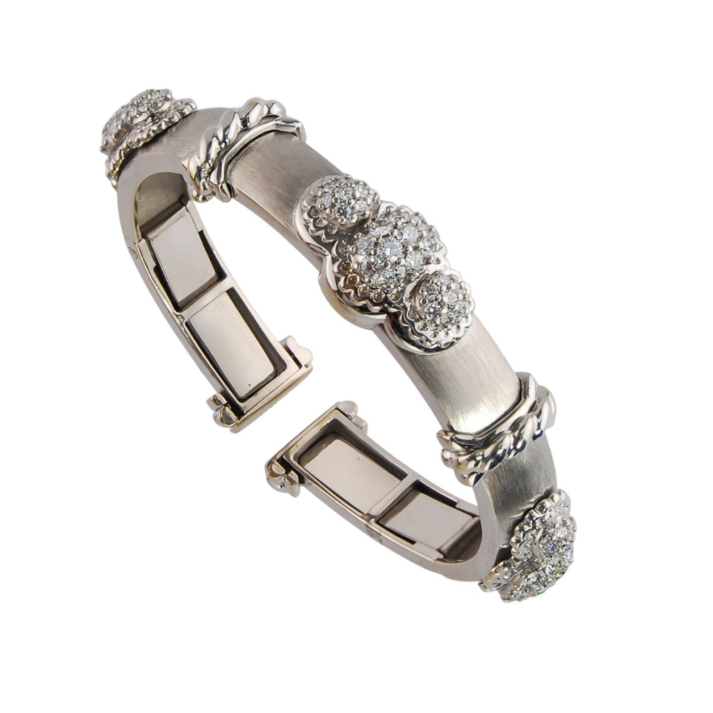 Callista Diamond Clip Bangle Designed & Handmade by Kaufmann de Suisse in 18kt White Gold and Platinum featuring 72 Round Brilliant cut F/VVS Quality Diamonds weighing a totalof 2.46cts.
