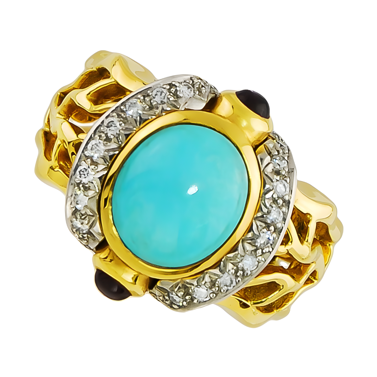 Open Flowing Lines Turquoise and Diamond Ring Designed and Handmade by Kaufmann de Suisse in 18kt Yellow Gold and Platinum featuring 1 Robin’s Egg Turquoise weighing 2.82cts and 24 Round Brilliant cut F/VVS Quality Diamonds weighing a total of 0.23cts, and 2 Red Cabochon Cut Garnets weighing a total of 0.44cts