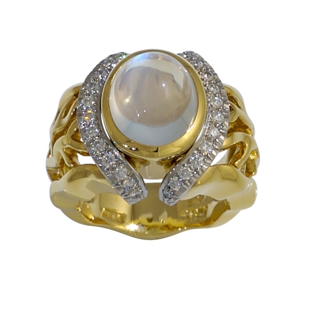 Open Flowing Lines Moonstone and Diamond Ring Designed and Handmade by Kaufmann de Suisse in 18kt Yellow Gold & Platinum featuring one 4.90cts Oval Cabochon Cut Moonstone flanked by 28 Round Brilliant Cut F/VVS Quality Diamonds weighing a total of 0.40cts