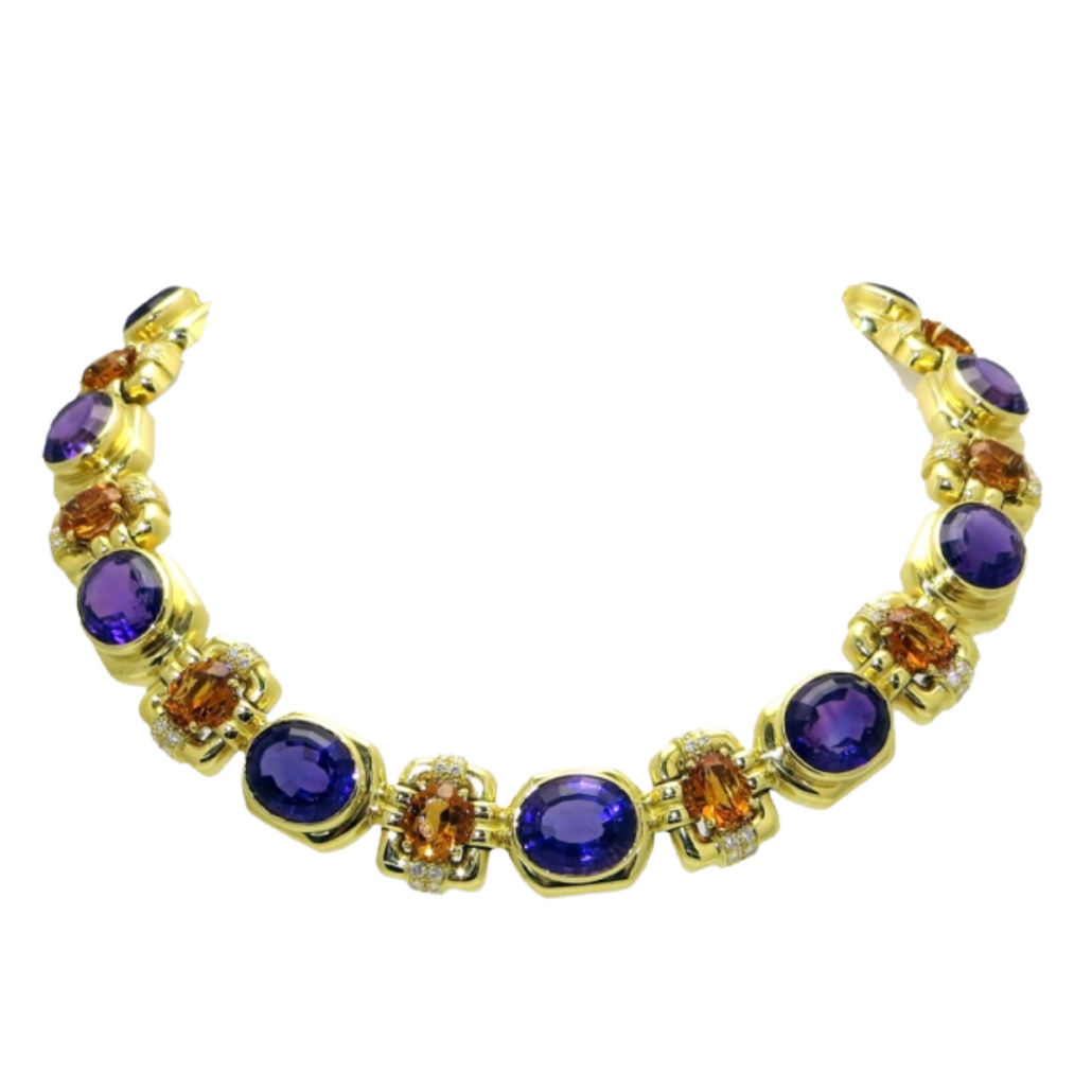 Citrine & Amethyst Necklace Designed & Handmade by Kaufmann de Suisse in 18kt Yellow Gold featuring 13 Amethysts weighing a total of 251.42ct and 13 Citrines weighing a total of 248.24cts