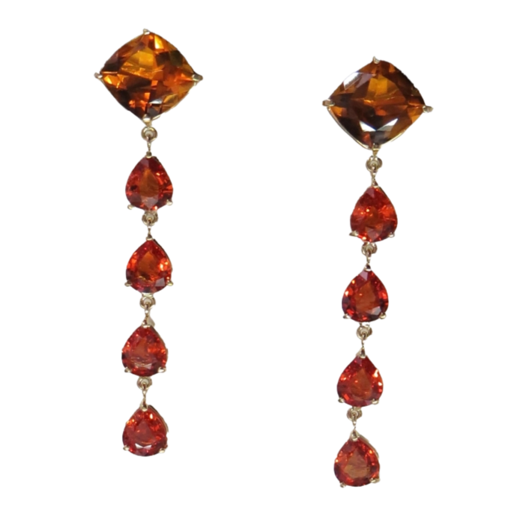 Citrine & Orange Sapphire Dangle Drop Earrings Designed & Handmade by Kaufmann de Suisse in 18kt Yellow Gold featuring 2 Cushion Cut Citrines weighing a total of 7.69cts and 8 Pear Shape Orange Sapphires weighing a total of 10.59cts