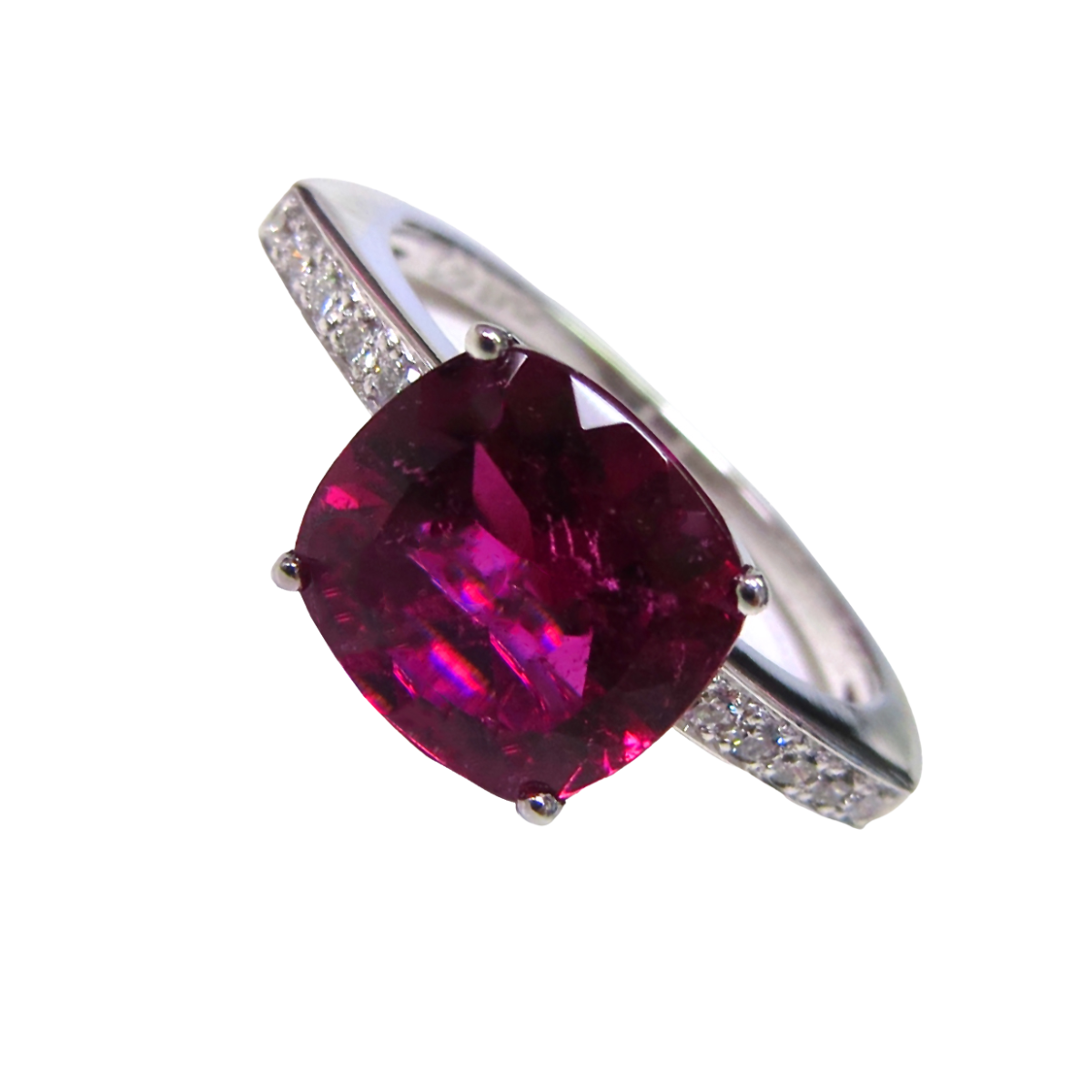 Classic Rubellite and Diamond Ring Designed & Handmade by Kaufmann de Suisse in Platinum featuring 1 Cushion cut Rubellite weighing 2.80cts mounted with 12 Round Brilliant cut F/VVS Diamonds weighing a total of 0.12cts