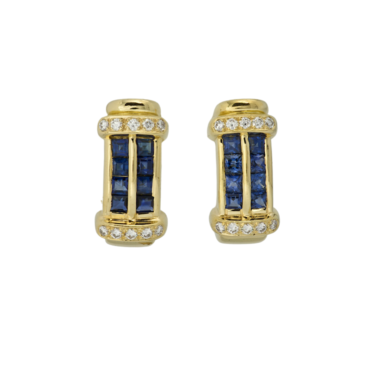 Classic Sapphire & Diamond Clip Back Rectangular Huggy Earrings Designed & Handmade by Kaufmann de Suisse in 18kt Yellow Gold featuring 16 Square Cut Sapphires weighing a total of 1.38cts and 20 Round Brilliant cut F/VVS Quality Diamonds weighing a total of 0.25cts