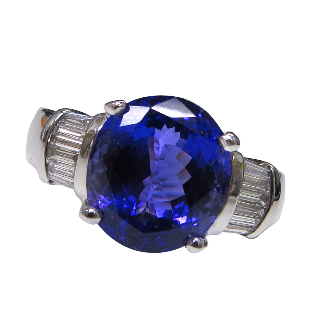 Classic Tanzanite and Diamond Ring Designed & Handmade by Kaufmann de Suisse in 18kt White Gold featuring 1 Oval Tanzanite weighing 6.44cts flanked by 12 Baguette H/VS Quality Diamonds weighing a total 0.42cts
