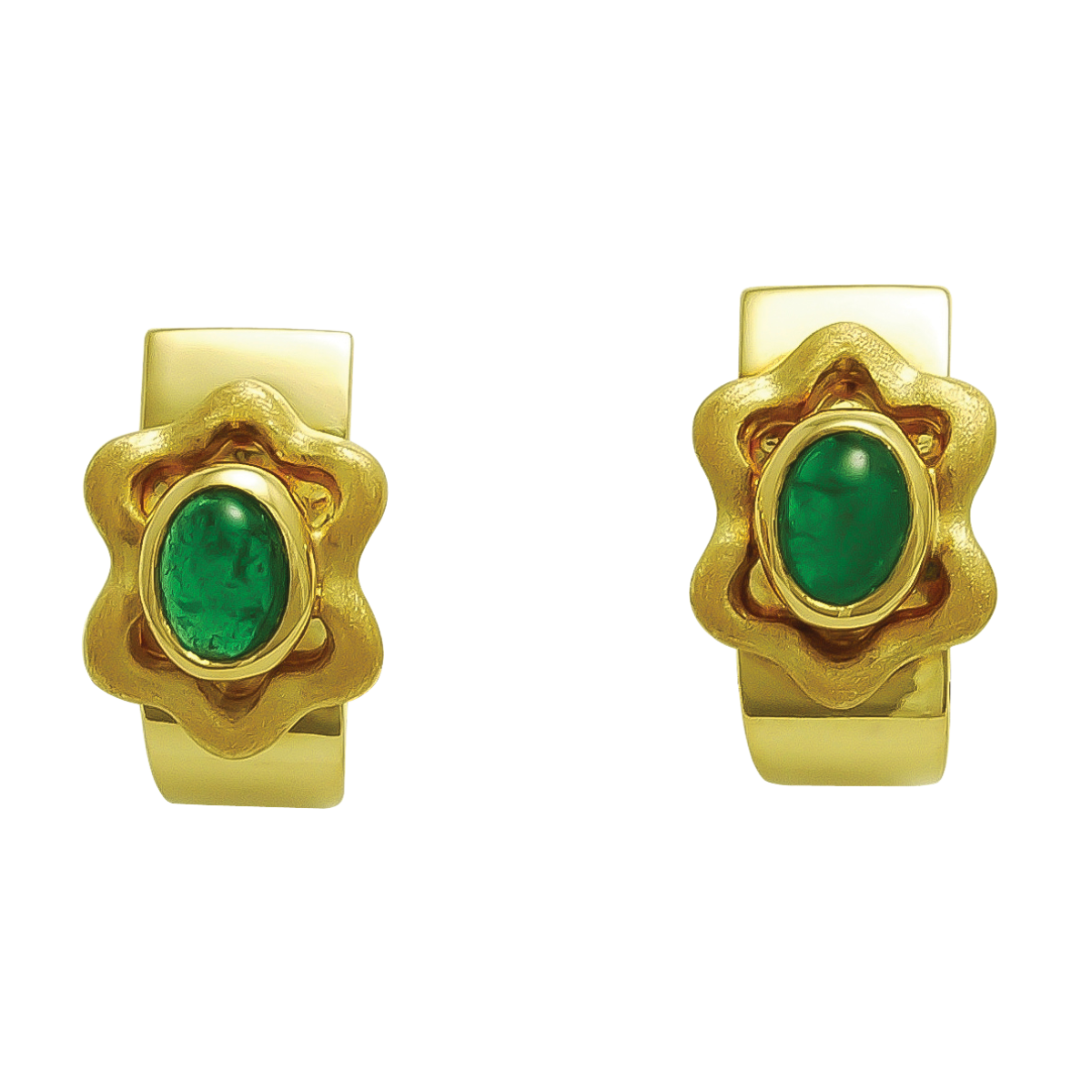 Callista Clip On Earrings Designed & Handmade by Kaufmann de Suisse in 18kt Yellow Gold featuring 2 Oval Cabochon Cut Columbian Emeralds weighing a total of 1.01cts