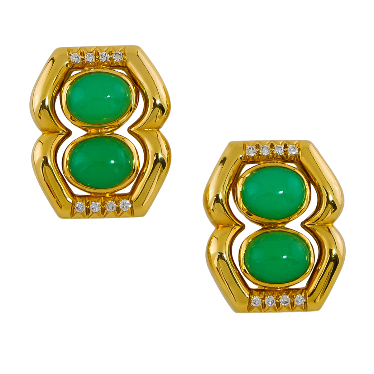 Chrysophrase & Diamond Clip on Earrings Designed & Handmade by Kaufmann de Suisse in 18kt Yellow Gold featuring 4 Oval Chrysophrase weighing a total of 1.60cts and 27 Round Brilliant Cut F/VVS Quality Diamonds weighing a total of 7.96cts