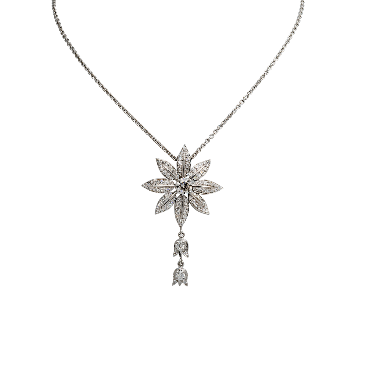 Lilly of the Valley Feuille Diamond Pendant Designed & Handmade by Kaufmann de Suisse in 18kt White Gold featuring 98 Round Brilliant Cut G/SI Quality Diamonds weighing a total of 1.36cts and one Round Brilliant Cut H/SI Quality Diamond weighing 0.84cts on a 16 Inch Black Silk Cord with White Gold Clasp