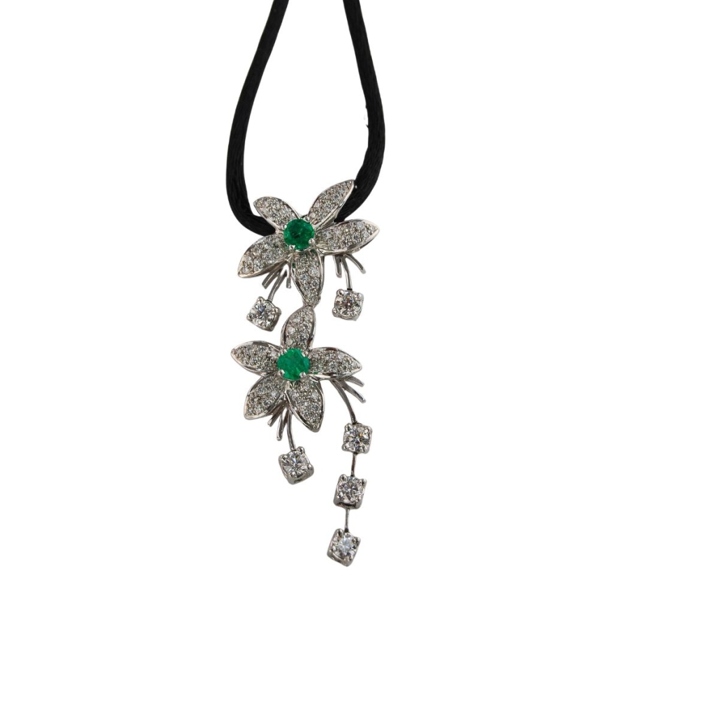 Jasmin de Nuit Emerald & Diamond Pendant Designed & Handmade by Kaufmann de Suisse in 18kt White Gold featuring 78 Round Brilliant Cut F/VVS Quality Diamonds weighing a total of 0.64cts, 6 Round Brilliant Cut G/VS Quality Diamonds weighing 0.78cts and 2 Round Emeralds weighing a total of 0.67cts on a 17 Inch Black Silk Cord with White Gold Clasp