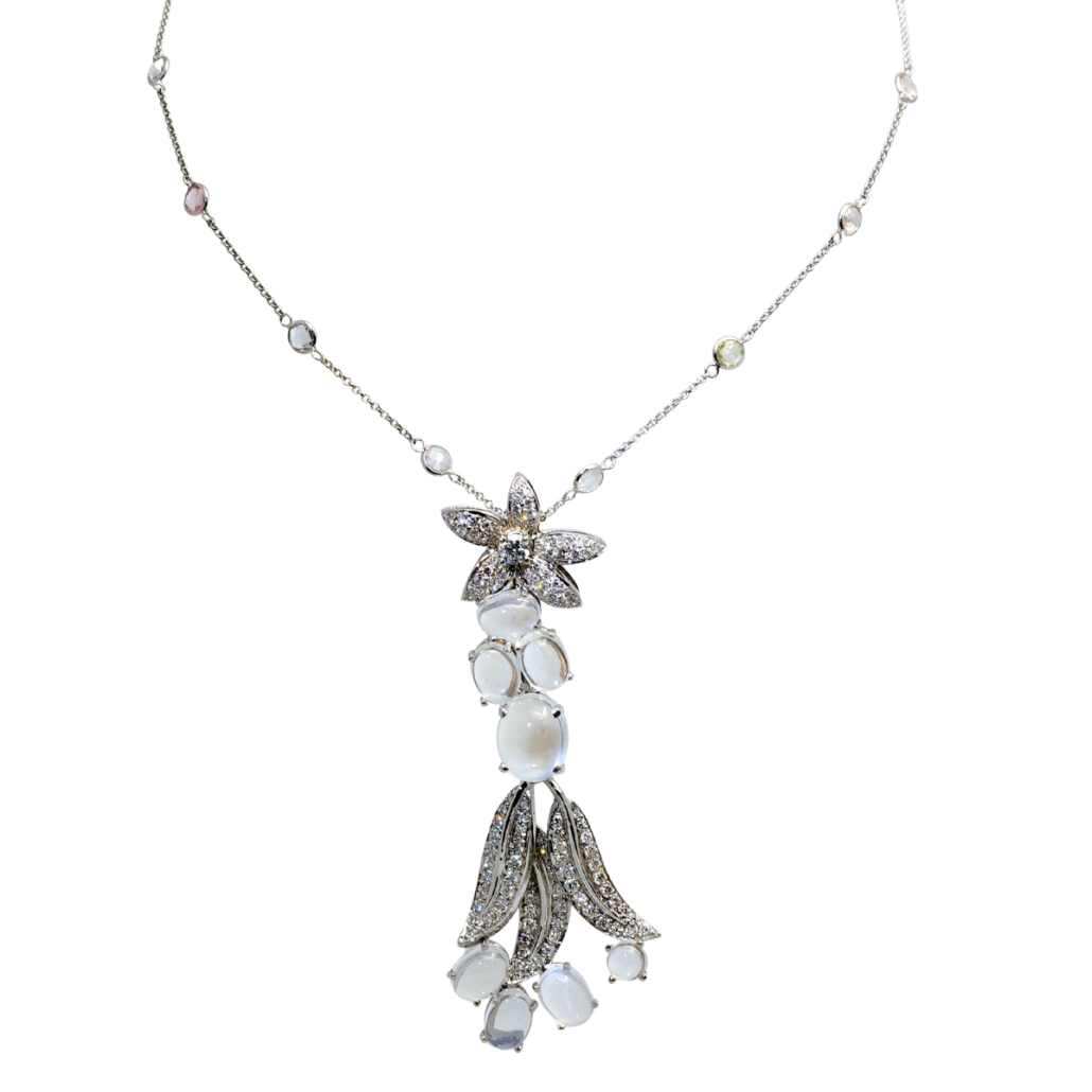 Jasmin de Nuit Feuille Necklace Designed and Handmade by Kaufmann de Suisse in 18kt White Gold featuring 108 Round Brilliant Cut G/SI Quality Diamonds weighing a total of 1.43cts and 8 Oval Cabochon Cut Moonstones weighing a total of 11.35cts on a 18inch 14kt White Gold Chain