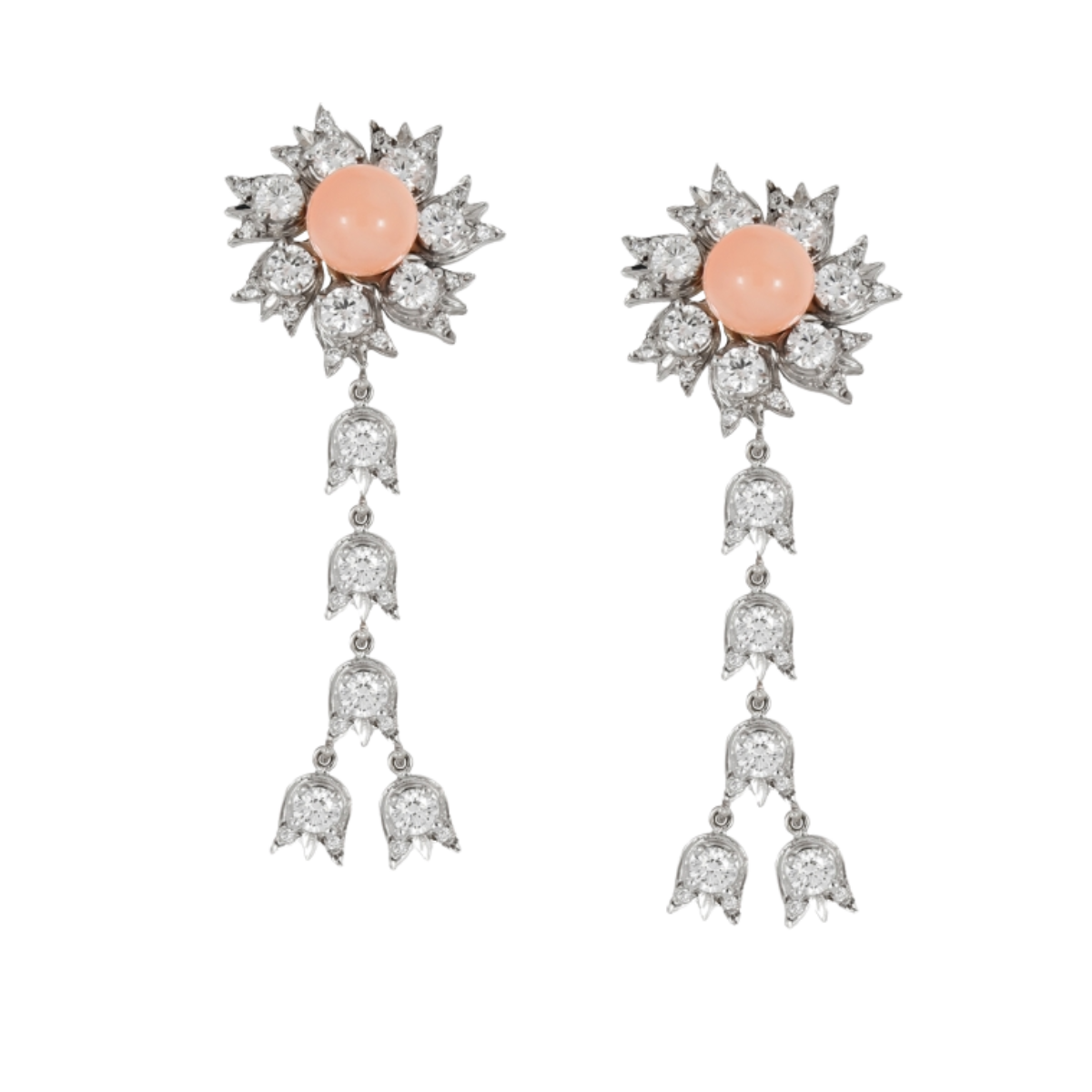 Designer Lilly of the Valley Coral & Diamond Dangle Drop Earrings in White Gold