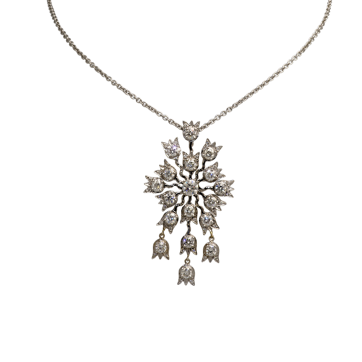 Lilly of the Valley Diamond Pendant Designed & Handmade by Kaufmann de Suisse in 18kt White Gold featuring 17 Round Brilliant Cut G/SI Quality Diamonds weighing a total of 3.40cts and 34 Round Brilliant Cut G/SI Quality Diamonds weighing a total of 0.26cts and one Round Brilliant Cut G/SI Quality Diamond weighing 0.60cts on a 16 Inch Black Silk Cord with White Gold Clasp