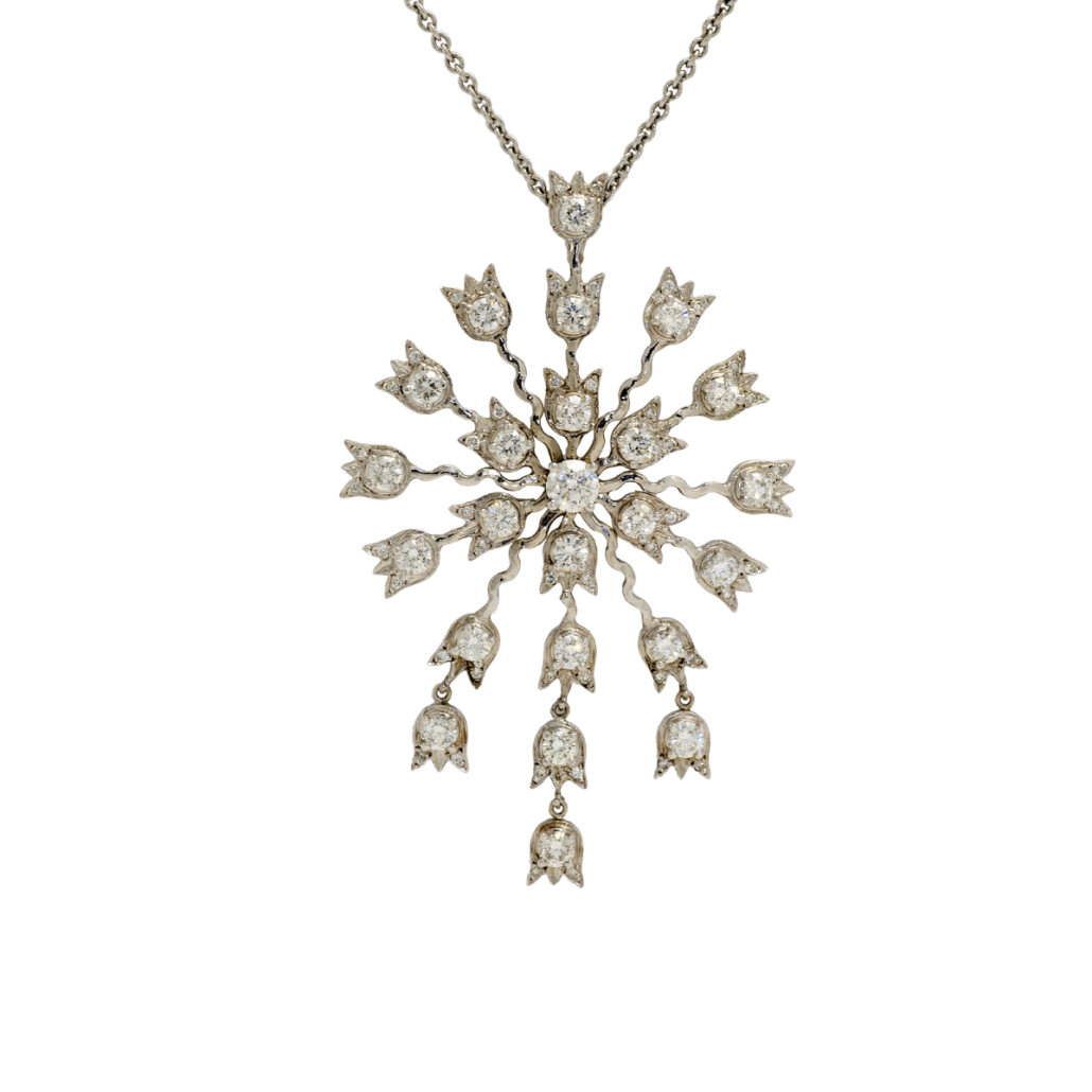 Lilly of the Valley Diamond Pendant Designed & Handmade by Kaufmann de Suisse in 18kt White Gold featuring 23 Round Brilliant Cut G/SI Quality Diamonds weighing a total of 4.14cts and 46 Round Brilliant Cut G/SI Quality Diamonds weighing a total of 0.35cts and one Round Brilliant Cut G/SI Quality Diamond weighing 0.60cts on a 16 Inch Black Silk Cord with White Gold Clasp