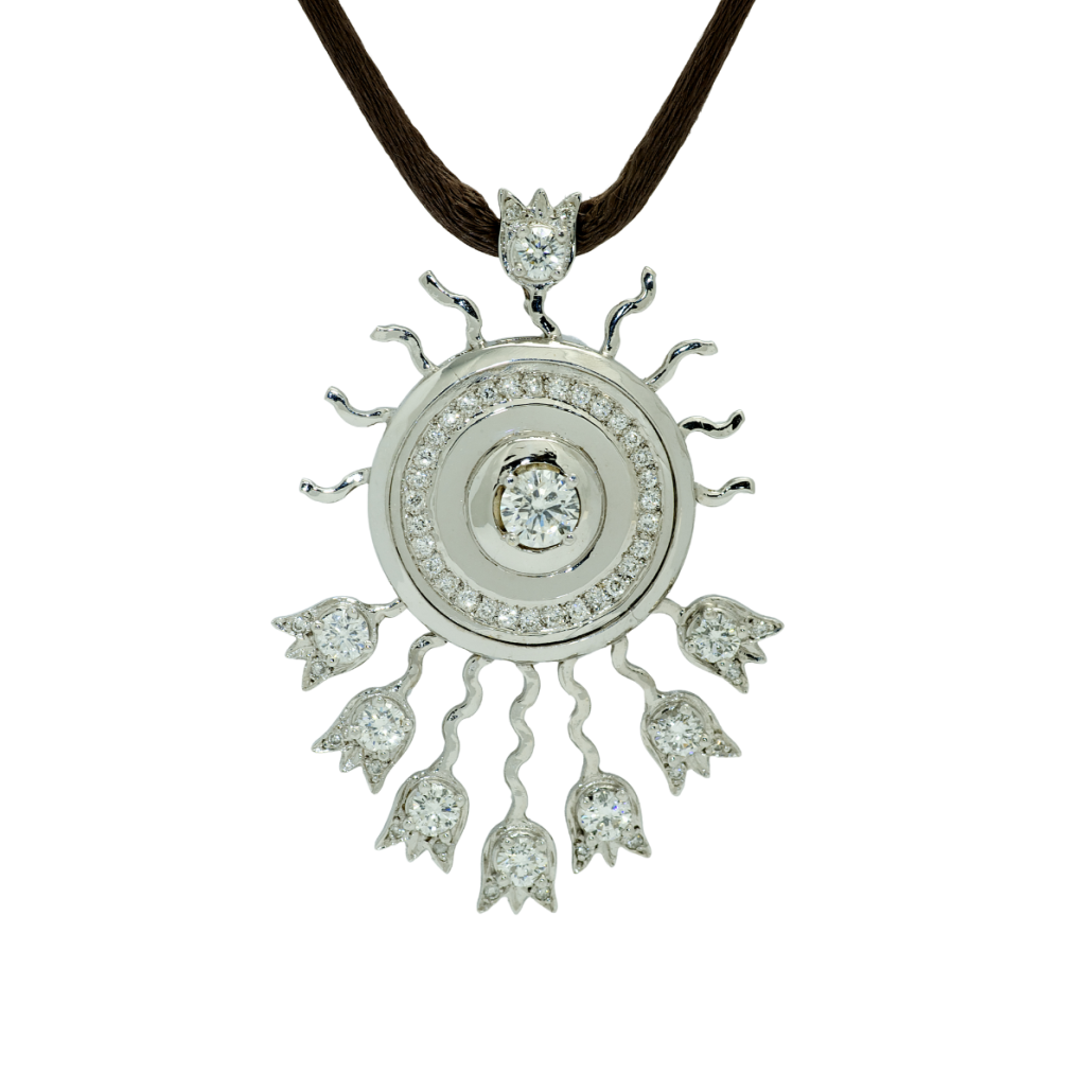 Designer Lilly of the Valley Diamond Pendant in White Gold on Brown Silk Cord with Gold Clasp