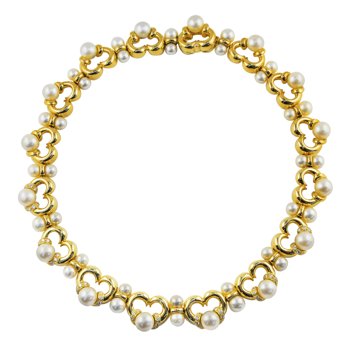 One of a Kind Yellow Gold, Diamond & Pearl Collar Necklace Designed & Handmade by Kaufmann de Suisse in 18kt Yellow Gold featuring 57 Round Brilliant Cut F/VVS Quality Diamonds weighing a total of 1.19cts and 48 Akoya Pearls measuring 6 – 8.7mm