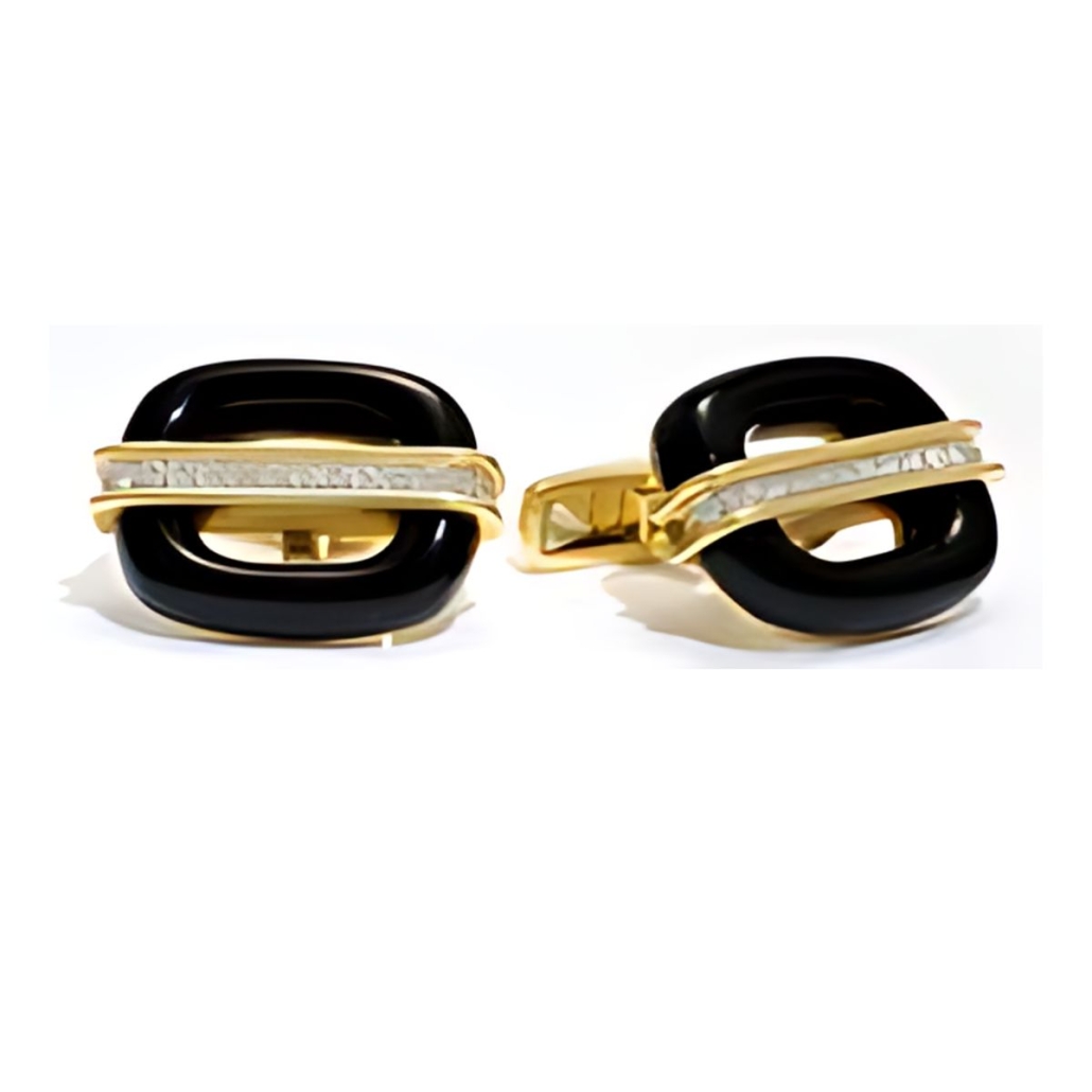 Onyx and Diamond Cufflinks Designed & Handmade by Kaufmann de Suisse in 18kt Yellow Gold & Platinum featuring 4 Carved Onyx measuring 5 x 20mm and 28 Round Brilliant Cut F/VVS Quality Diamonds weighing a total of 0.40cts