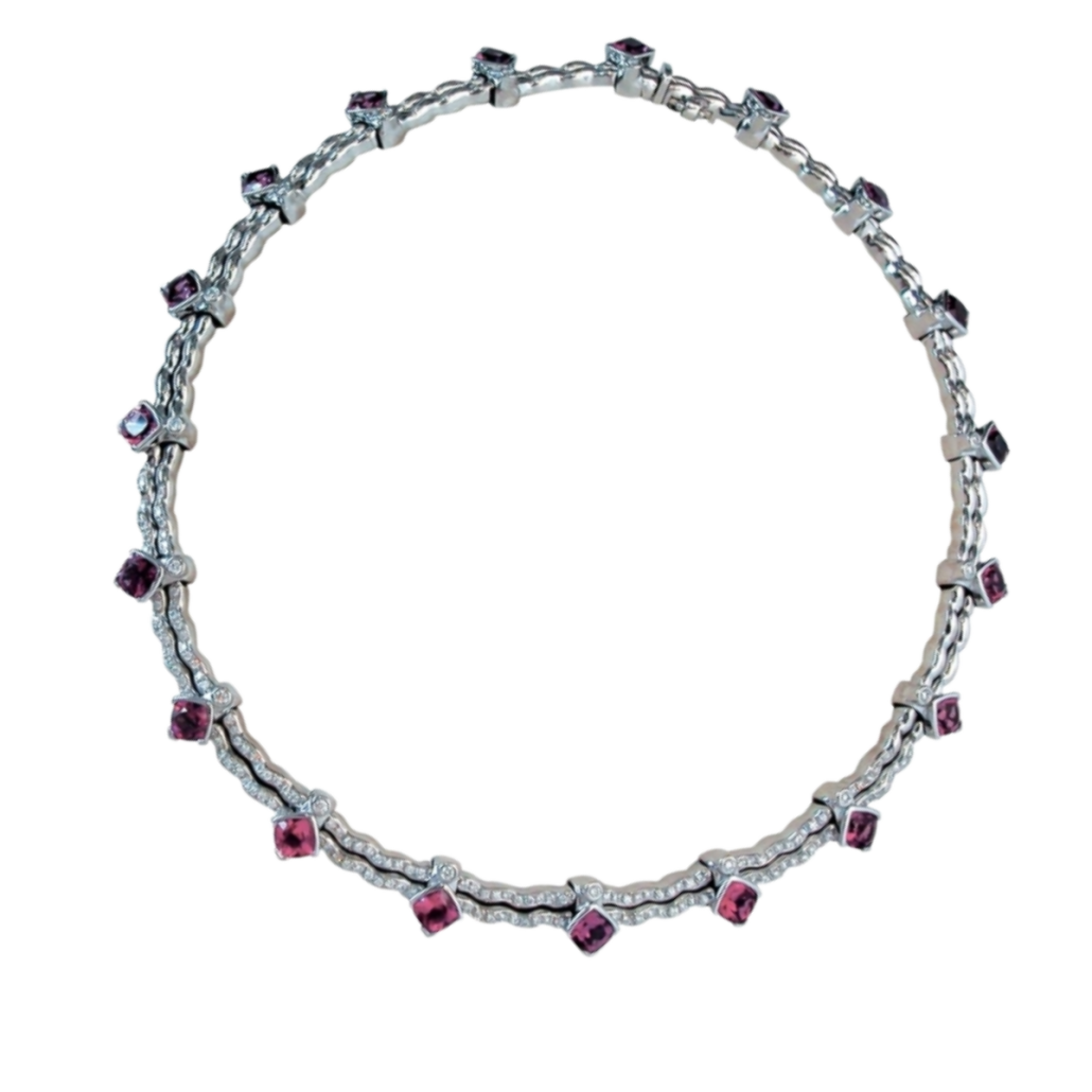Designer Pink Tourmaline & Diamond Necklace Designed & Handmade by Kaufmann de Suisse in 18kt White Gold featuring 19 Cushion Cut Pink Tourmalines weighing a total of 18.40cts and 61 Round Brilliant Cut F/VVS Quality Diamonds weighing a total of 1.97cts