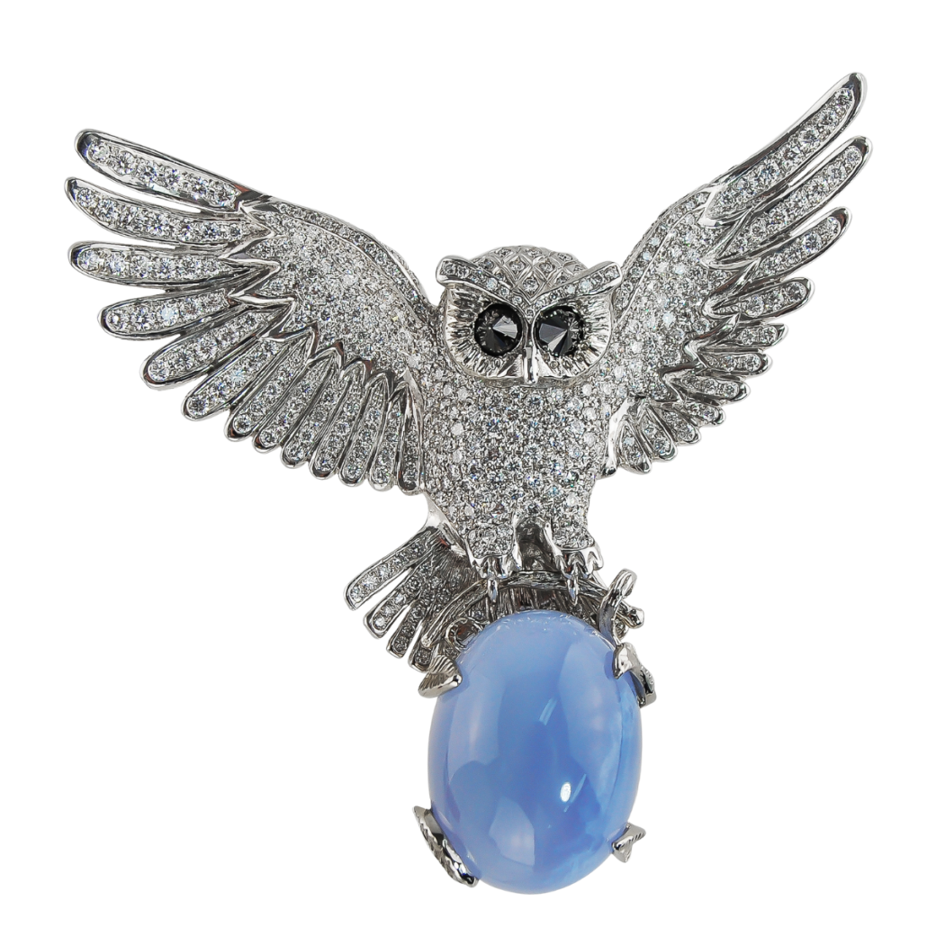 Diamond Owl Pendant (or Brooch) Designed & Handmade by Kaufmann de Suisse in 18kt White Gold featuring 410 Round Brilliant Cut F/VVS Quality Diamonds weighing a total of 4.79cts and 2 Black Round Brilliant Cut Set Upside Down Diamonds weighing a total of 0.66cts and one detachaeble Chalcedony Oval “Egg” measuring 22 x 17mm, 2 Inches Long and 2.5 Inches Wide