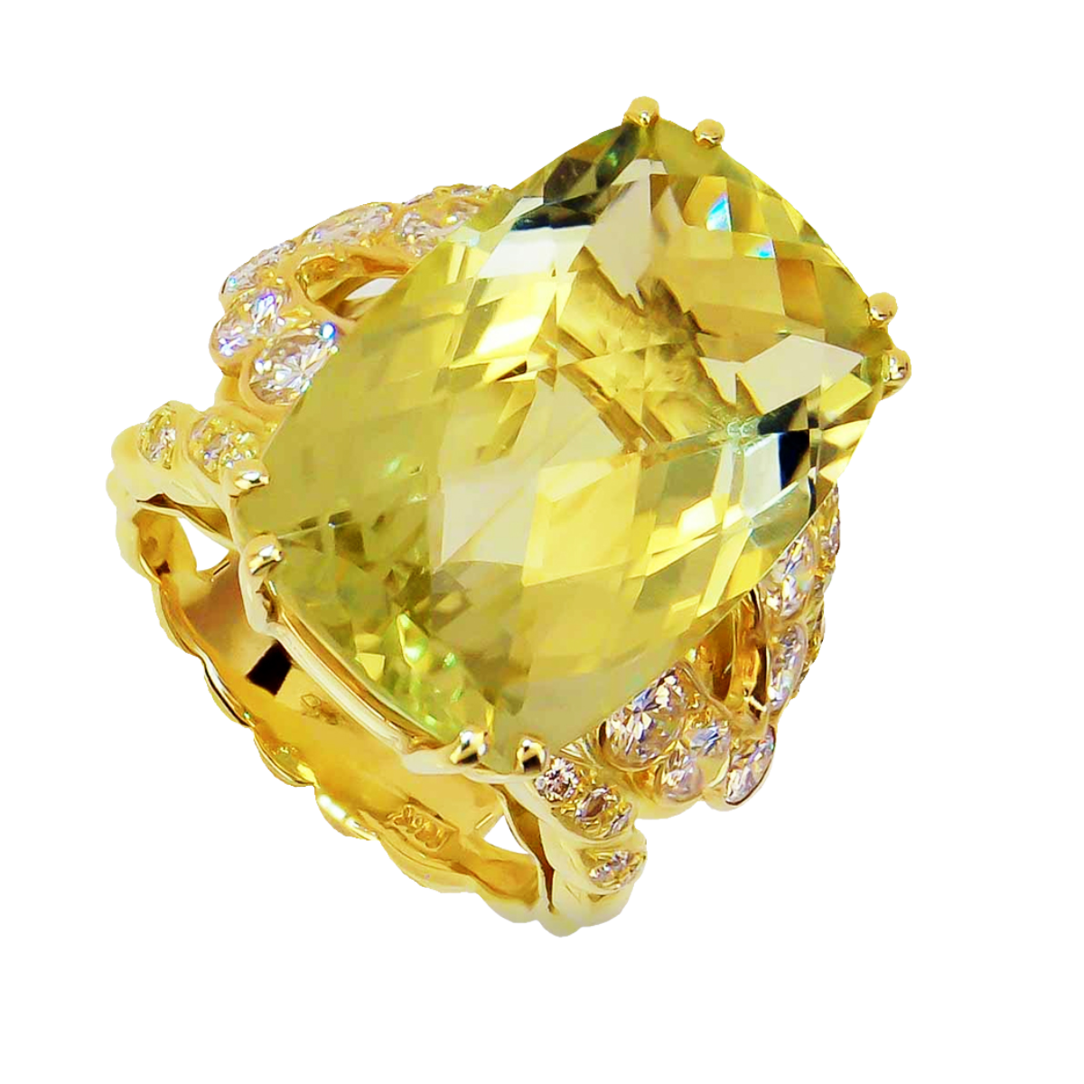 Double Flowing Lines Lemon Quartz and Diamond Ring Designed & Handmade by Kaufmann de Suisse in 18kt Yellow Gold featuring 19.25cts Cushion Lemon Quartz flanked and mounted with 30 Round Brilliant Cut G/VS Quality Diamonds weighing a total of 1.68cts