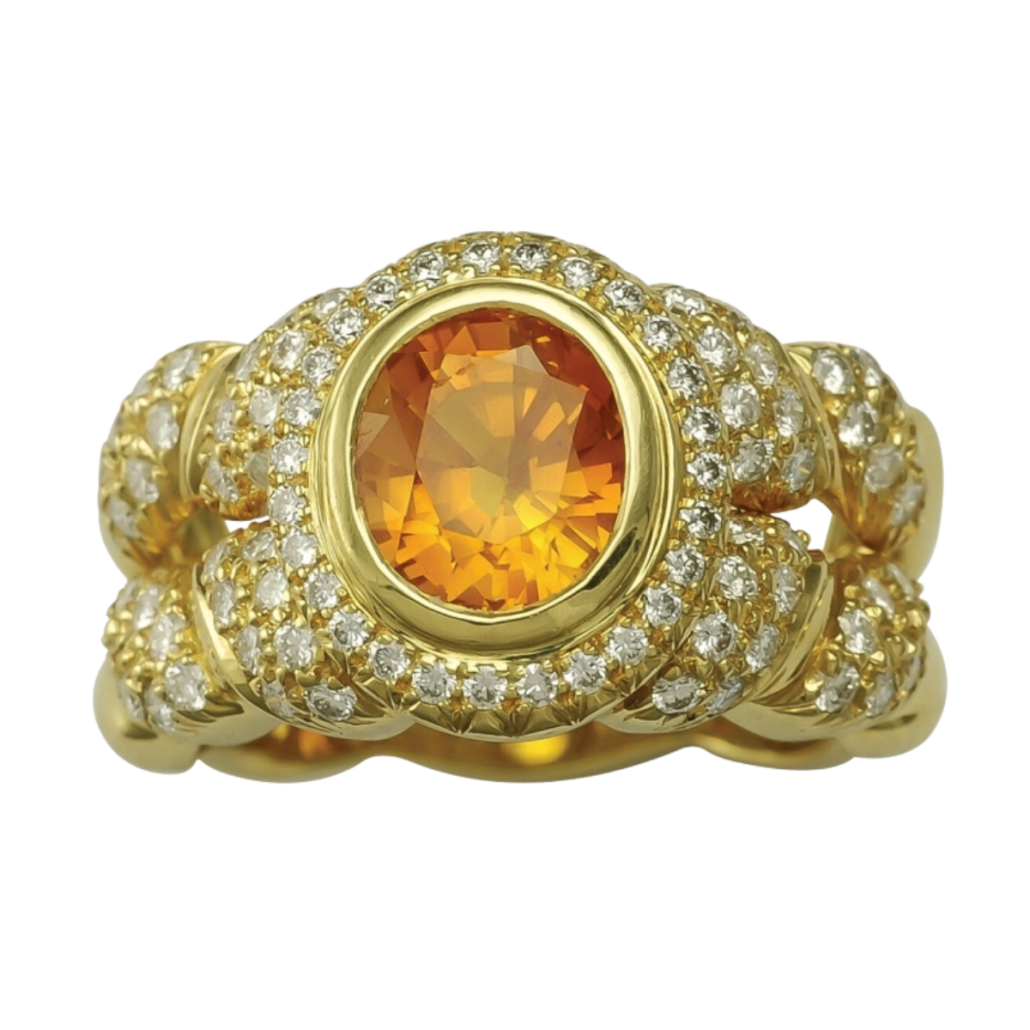 Double Flowing Lines Sapphire Ring Designed & Handmade by Kaufmann de Suisse in 18kt Yellow Gold featuring one 3.07cts Orange-Yellow Sapphire and mounted with 92 Round Brilliant Cut F/VVS Quality Diamonds weighing a total of 0.82cts