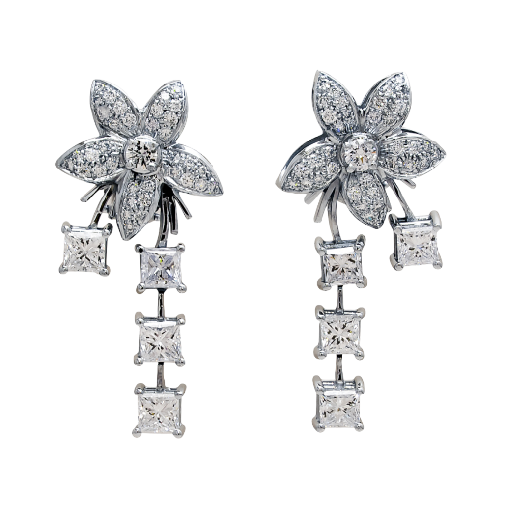 Jasmin de Nuit Diamond Drop Earrings Designed & Handmade by Kaufmann de Suisse in 18kt White Gold featuring 72 Round Brilliant Cut G/VS Quality Diamonds weighing a total of 1.12cts and 8 Princess Cut G/VS Quality Diamonds weighing a total of 3.87cts