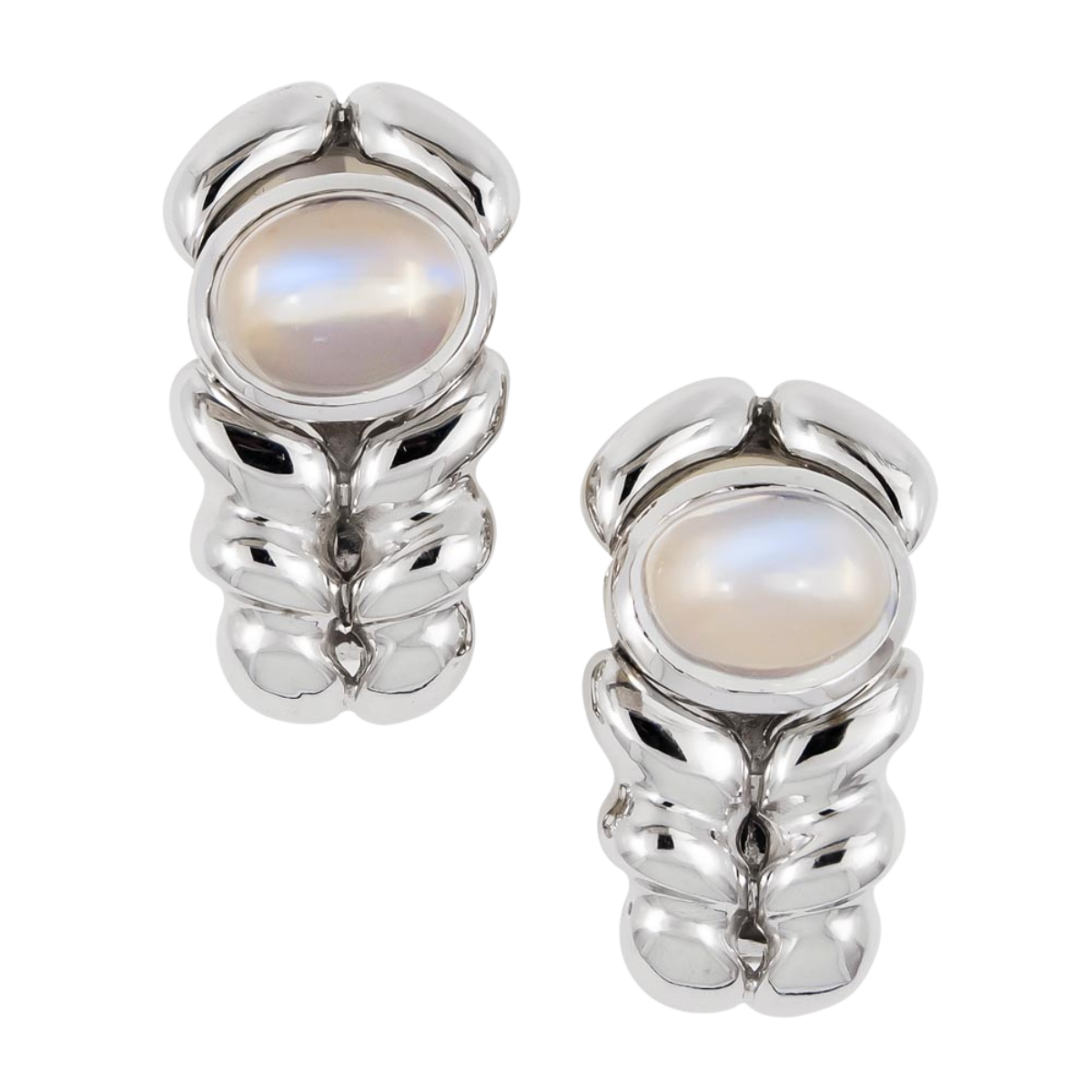 Double Flowing Lines Moonstone Earrings, Handmade in 18k White Gold with 2 Moonstones Weighing 6.00 Carats Total