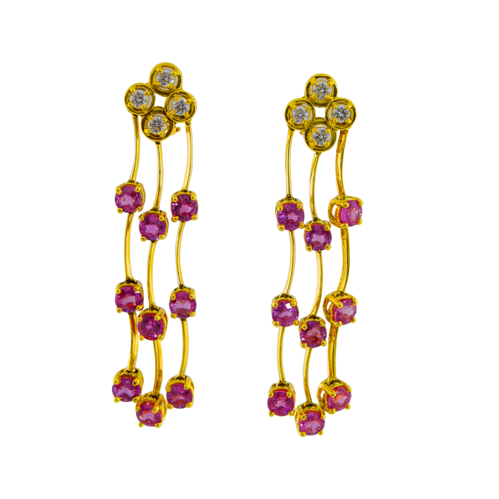 Triple Cascade Pink Sapphire Dangle Drop Earrings Designed & Handmade by Kaufmann de Suisse in 18kt Yellow Gold featuring 8 Round Brilliant Cut G/VS Quality Diamonds weighing a total of 1.18cts and 18 Round Pink Sapphires weighing a total of 12.49cts