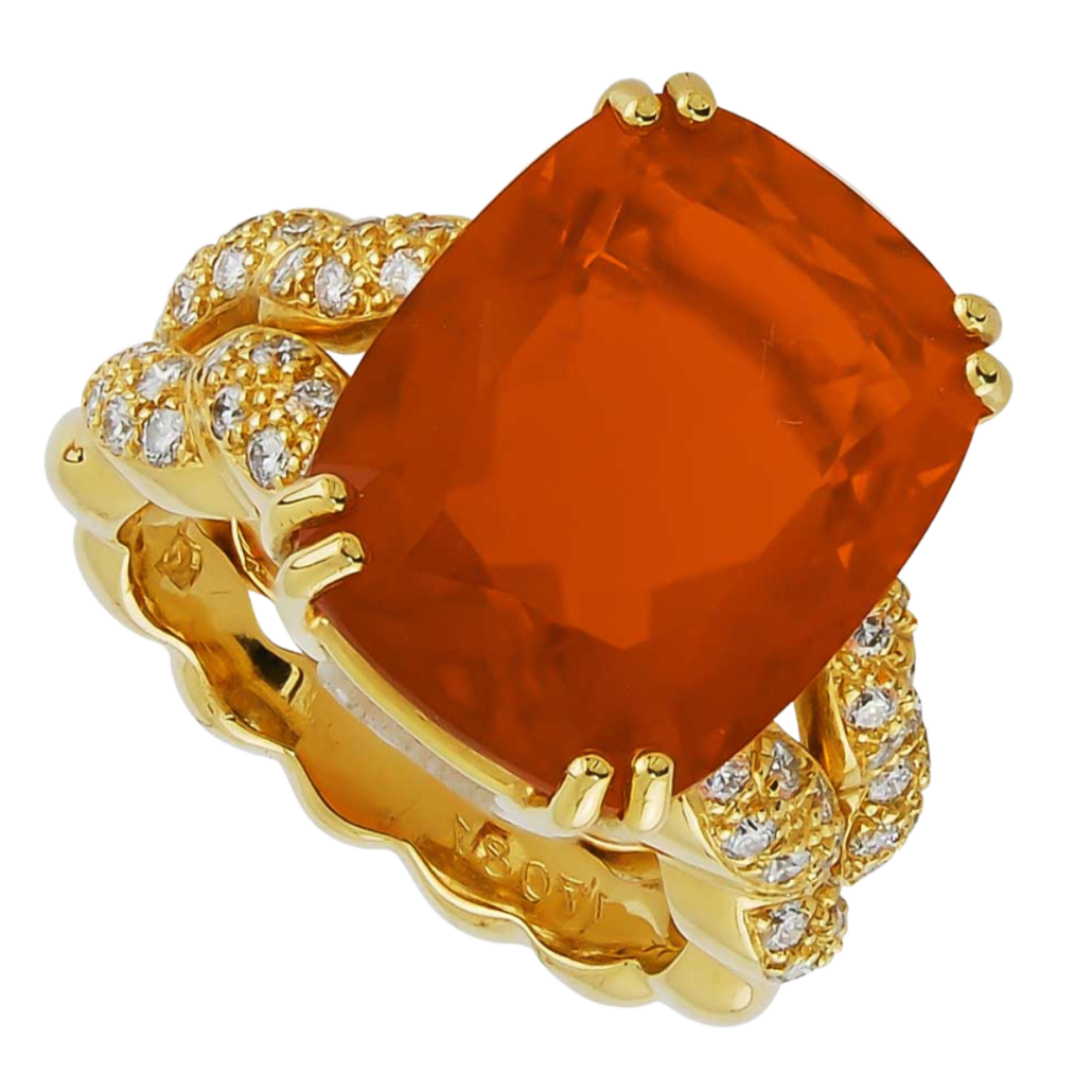Double Flowing Lines Fire Opal and Diamond Ring Designed and Handmade by Kaufmann de Suisse in 18kt Yellow Gold featuring 1 Cushion Cut Fire Opal weighing 7.60cts mounted with 36 Round Brilliant Cut F/VVS Quality Diamonds weighing a total of 0.50cts
