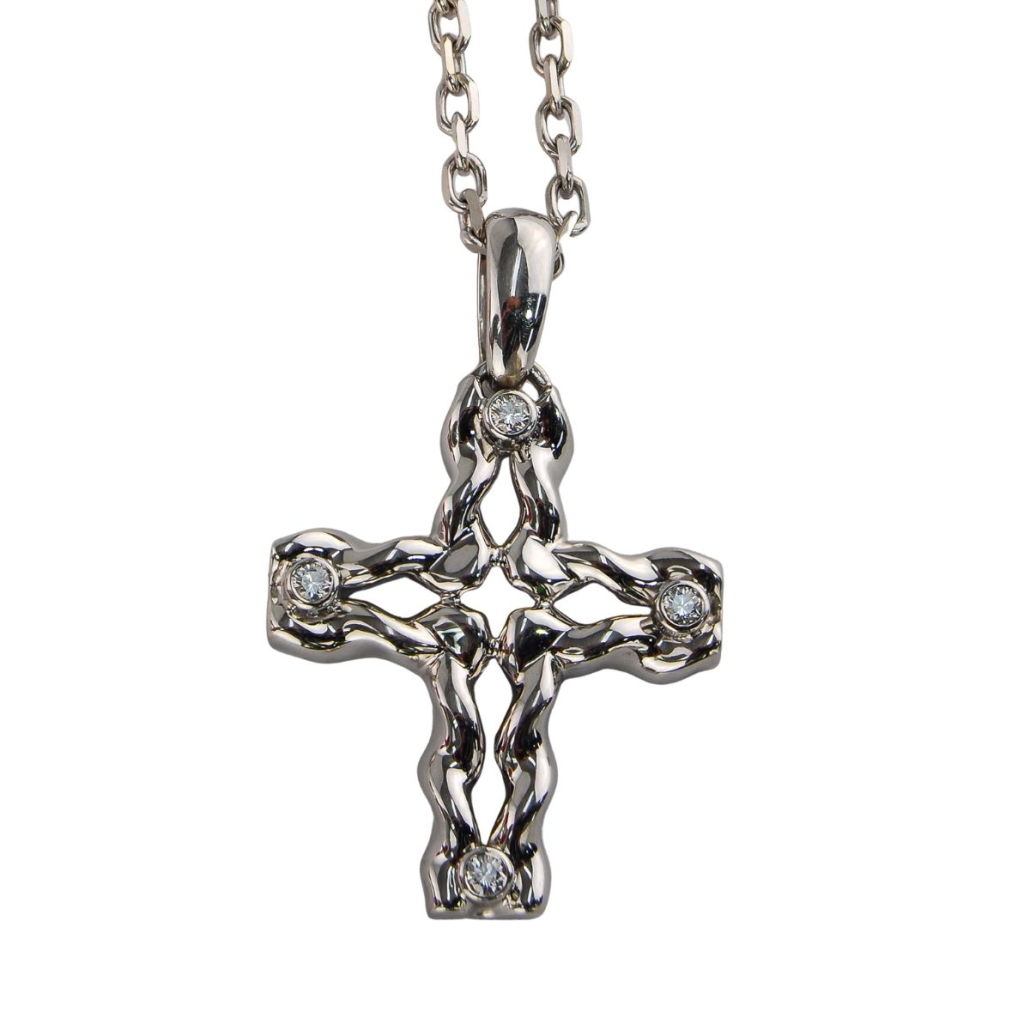 Flowing Lines Diamond Cross Designed & Handmade by Kaufmann de Suisse in 18kt White Gold featuring 4 Round Brilliant Cut F/VVS Quality Diamonds weighing a total of 0.20cts