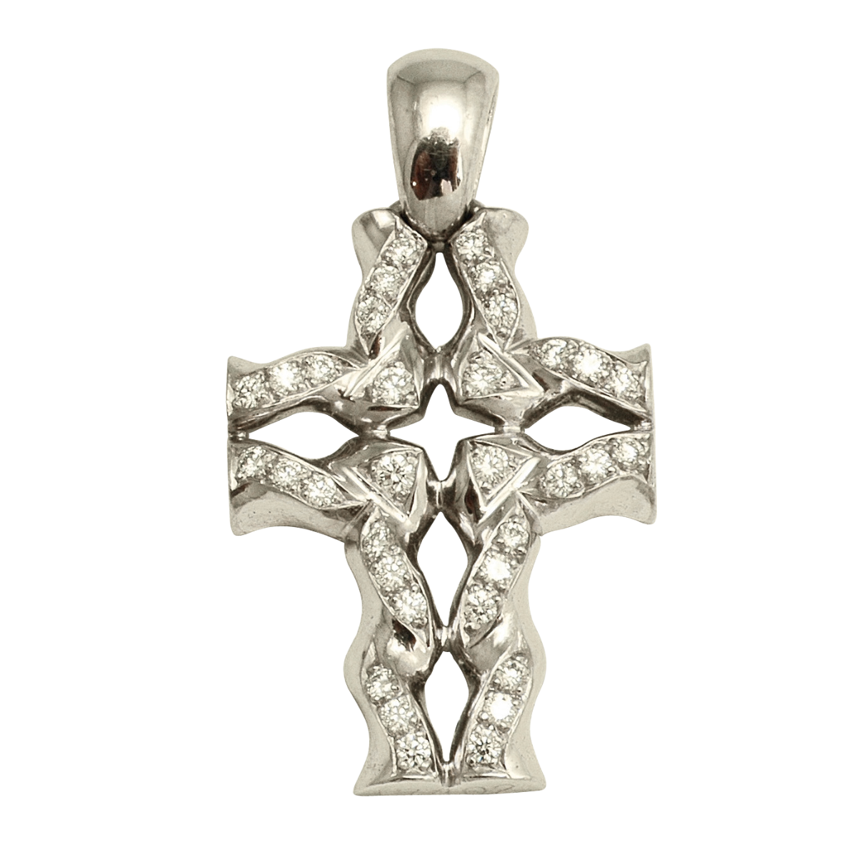 Flowing Lines Diamond Cross Pendant Designed & Handmade by Kaufmann de Suisse in 18kt White Gold featuring 34 Round Brilliant Cut F/VVS Quality Diamonds weighing a total of 0.42cts on a 18 Inch 14kt White Gold Chain