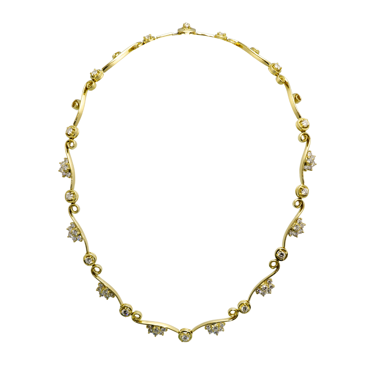 Flowing Lines Diamond Fleurette Necklace Designed and Handmade by Kaufmann de Suisse in 18kt Yellow Gold featuring 62 Round Brilliant cut G/SI Quality Diamonds weighing a total of 5.41cts.