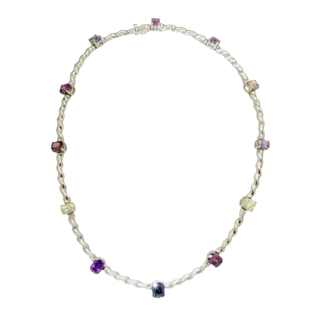 Flowing Lines Multi-Color Sapphire & Diamond Chocker Necklace in White Gold