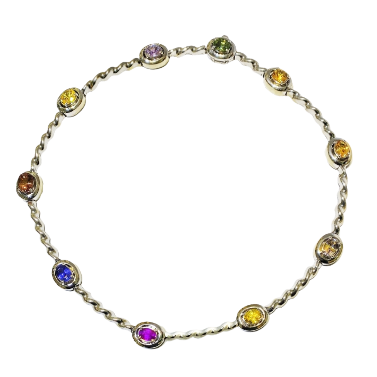 Flowing Lines Sapphire & Diamond Collar Necklace Designed & Handmade by Kaufmann de Suisse in 18kt White Gold featuring 10 Oval Cut Multi-Color Sapphires weighing a total of 12.16cts