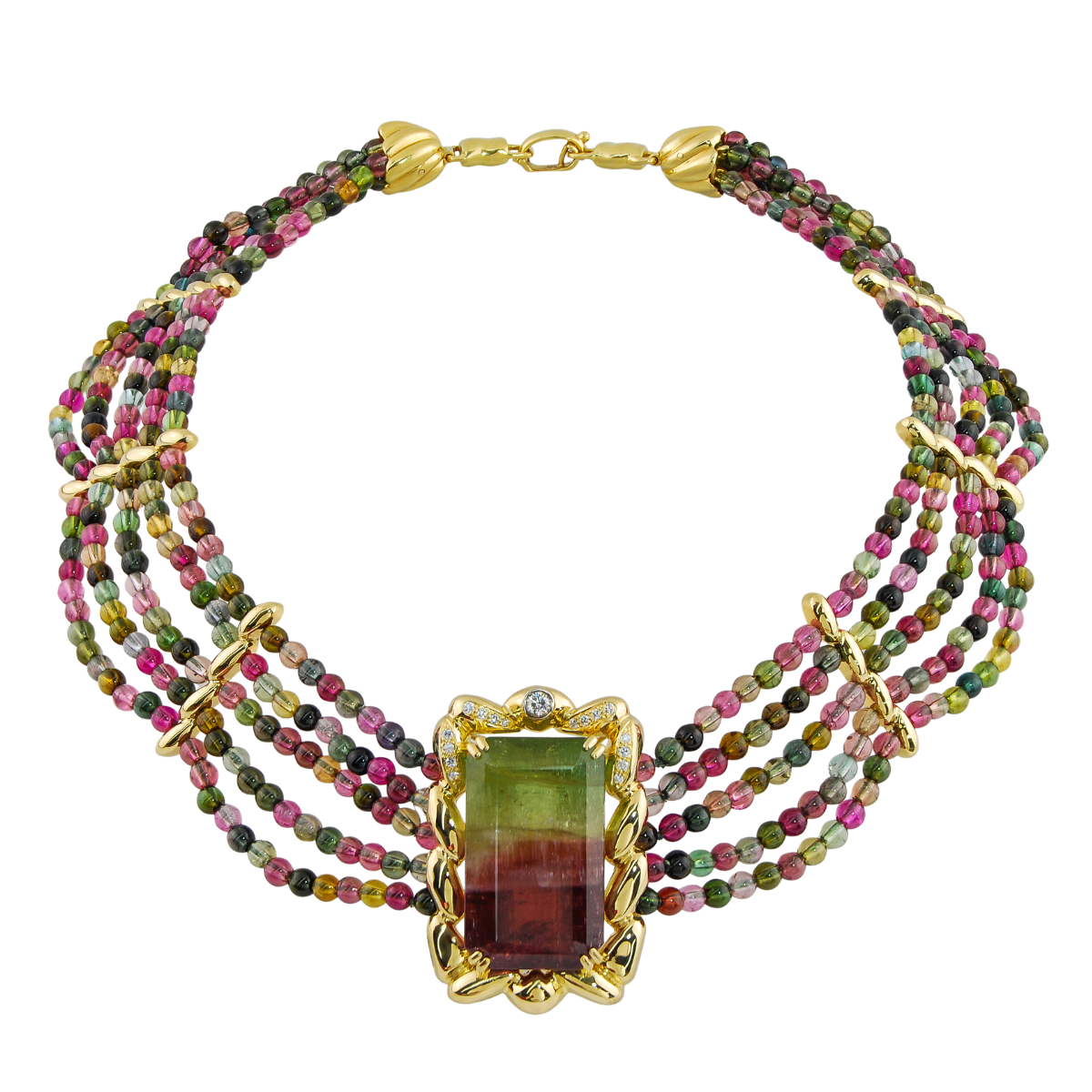 Flowing Lines Multi-Color Tourmaline Necklace Designed & Handmade by Kaufmann de Suisse in 18kt Yellow Gold featuring one Emerald Cut 96.32cts Watermelon Tourmaline and 17 Round Brilliant cut F/VVS Quality Diamonds weighing a total of 0.42cts all on Multi-Color Tourmaline Beads