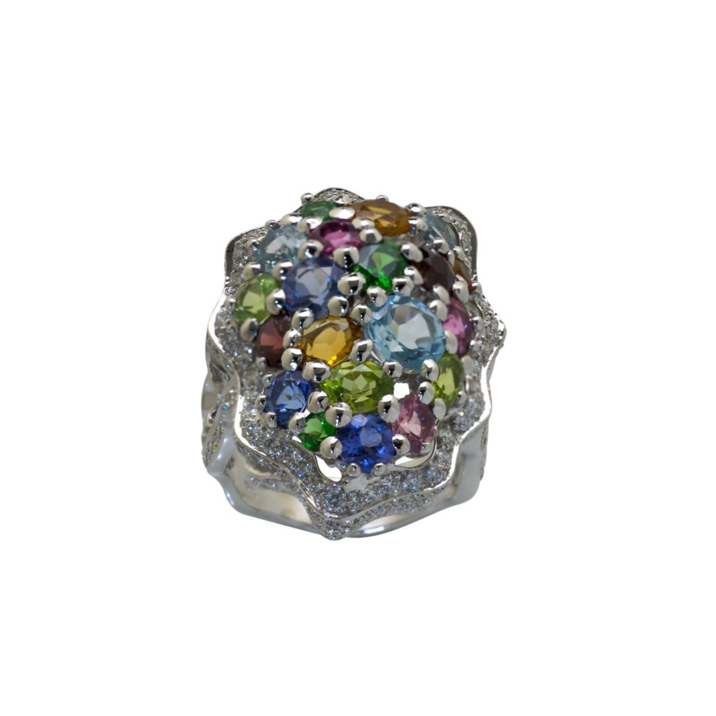 Flowing Lines Multi-Stone Wave Ring Designed and Handmade by Kaufmann de Suisse in 18kt White Gold featuring 2 Rhodolite Garnets, 3 Peridots, 3 Tanzanites, 3 Aquamarines, 3 Citrines, 3 Tsavorite Garnets, 3 Pink Tourmalines and 159 Round Brilliant Cut F/VVS Quality Diamonds weighing a total of 1.20cts