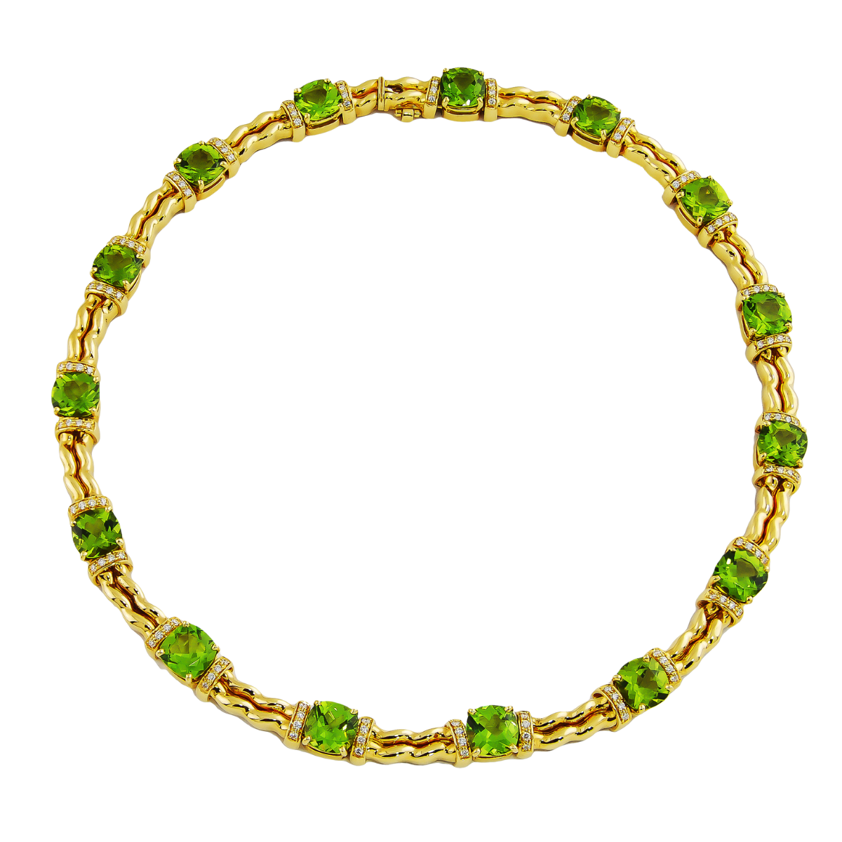 Peridot & Diamond Necklace Designed & Handmade by Kaufmann de Suisse in 18kt Yellow Gold featuring 15 Cushion Cut Peridot weighing a total of 43.35cts and 130 Round Brilliant cut F/VVS Quality Diamonds weighing a total of 1.63cts