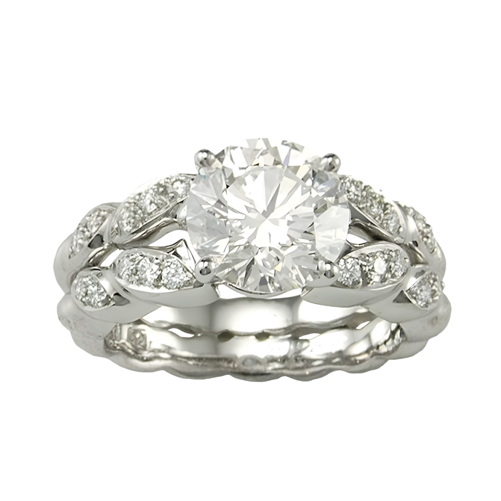 Double Flowing Lines Ring Designed & Handmade by Kaufmann de Suisse in Platinum featuring 1 Round 1.55cts GIA Certified E/VVS1 Quality Round Diamond with a Halo of 34 Round Brilliant Cut Diamonds weighing a total of 0.50cts