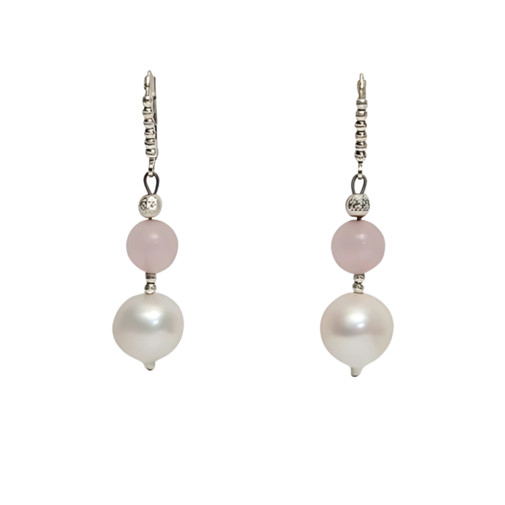 - Freshwater White Pearl and Rose Quartz Dangle Earrings