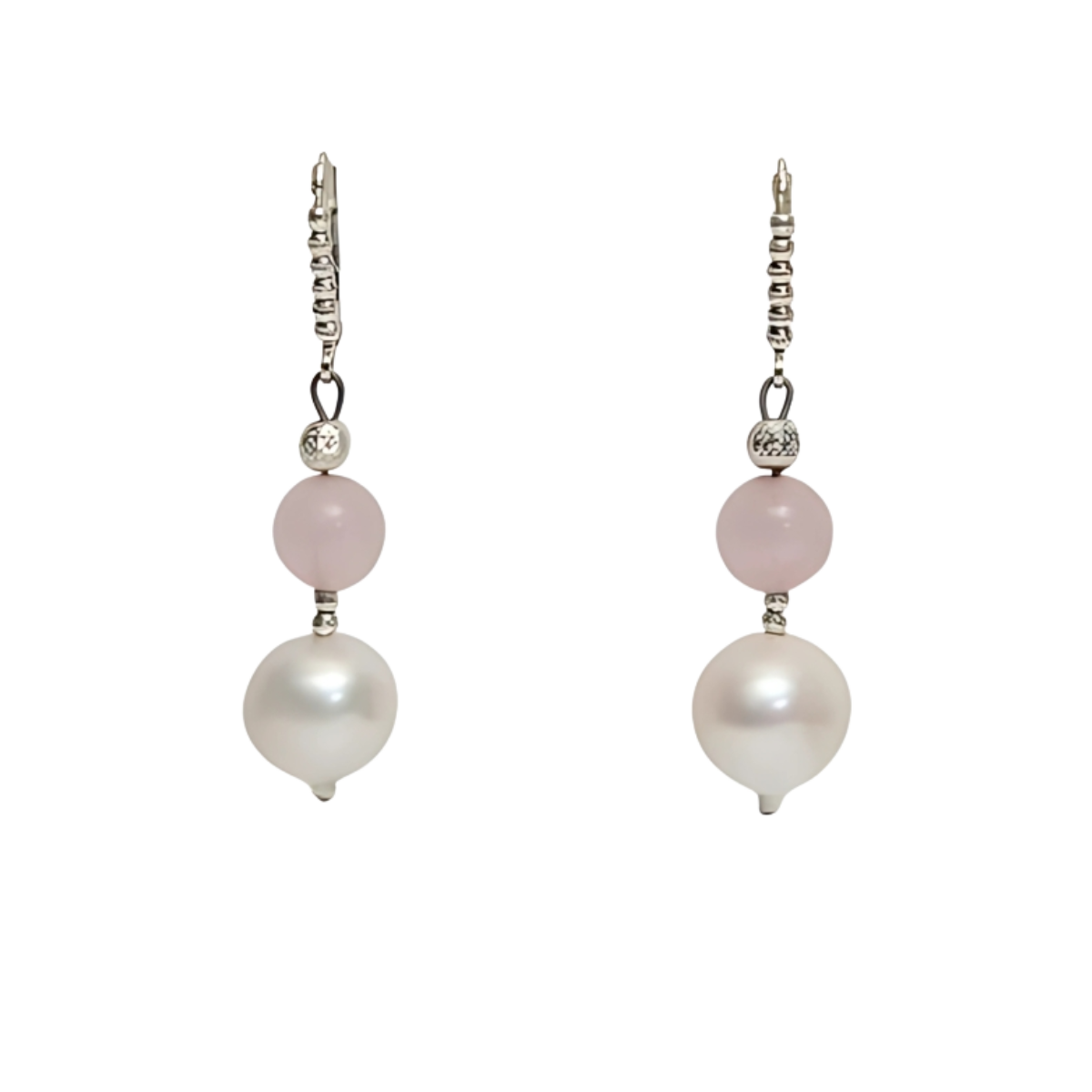 • Freshwater White Pearl and Rose Quartz Dangle Earrings