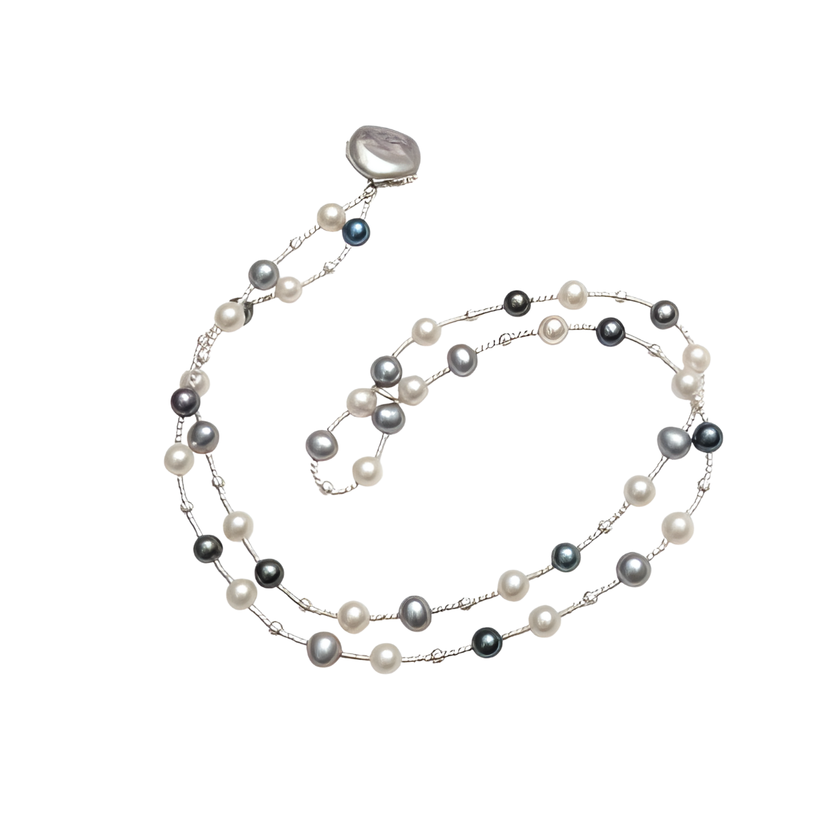 Grey, White & Black Dyed Pearl Wrap Bracelet with Coin Pearl ClosureBeautifully Accented With Diamond Cut Sterling Silver Beads