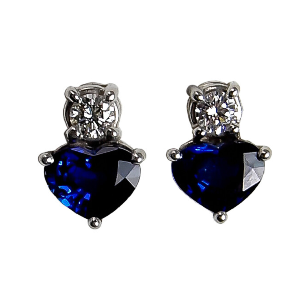 Heart Shaped Blue Sapphire & Diamond Stud Earrings Handmade by Kaufmann de Suisse in Platinum featuring 2 Heart Shaped Blue Sapphires weighing a total of 2.40cts and 2 Round Brilliant Cut F/VVS Quality Diamonds weighing a total of 0.25cts