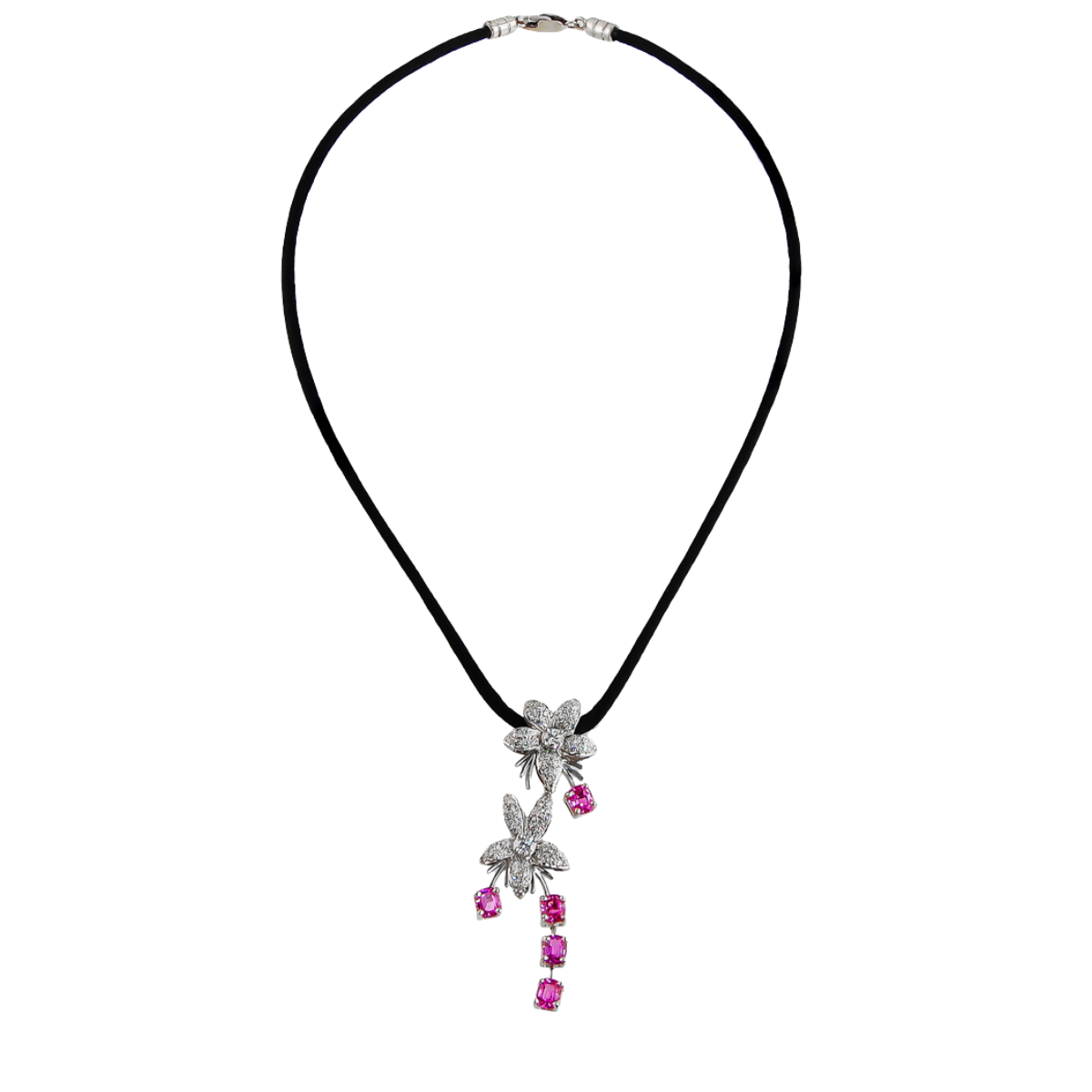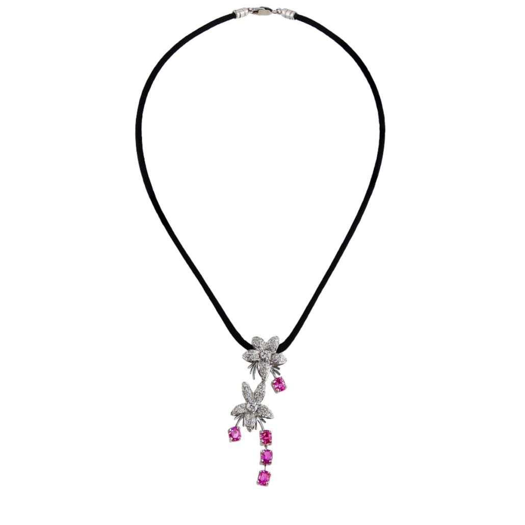 Jasmin de Nuit Pink Sapphire & Diamond Pendant Designed & Handmade by Kaufmann de Suisse in 18kt White Gold featuring 72 Round Brilliant Cut G/VS Quality Diamonds weighing a total of 1.22cts and 5 Oval Pink Sapphires weighing a total of 3.65cts on 17 Inch Black Silk Cord with White Gold Clasp