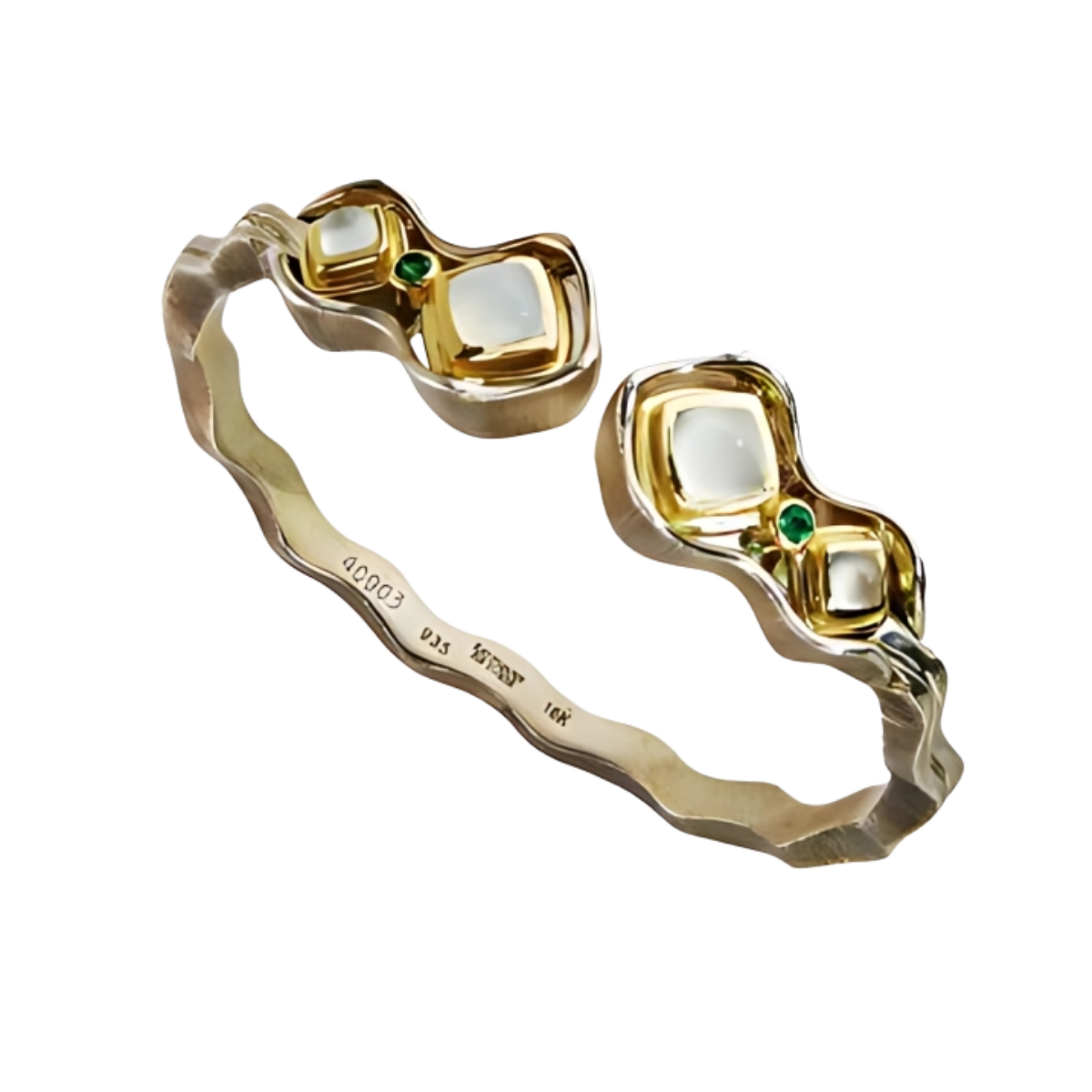 Jardins de la Mer Blue Chalcedony & Tsavorite Clip Bangle Bracelet Designed & Handmade by Kaufmann de Suisse in 18kt Yellow Gold and Argentium featuring 2 Cabochon Cushion cut Blue Chalcedony measuring 7mm and 2 measuring 4mm and 2 Round Tsavorite Garnets measuring 3mm