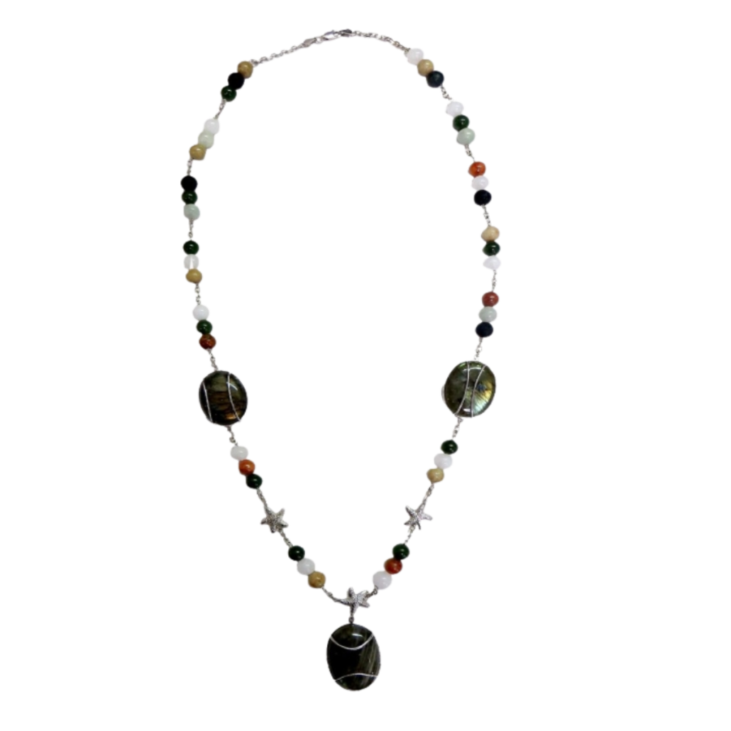 Labradorite Starfish Necklace with Nephrite Jade Beads in White Gold